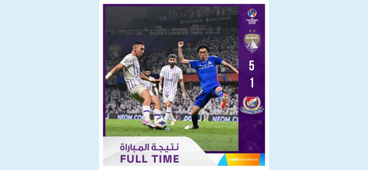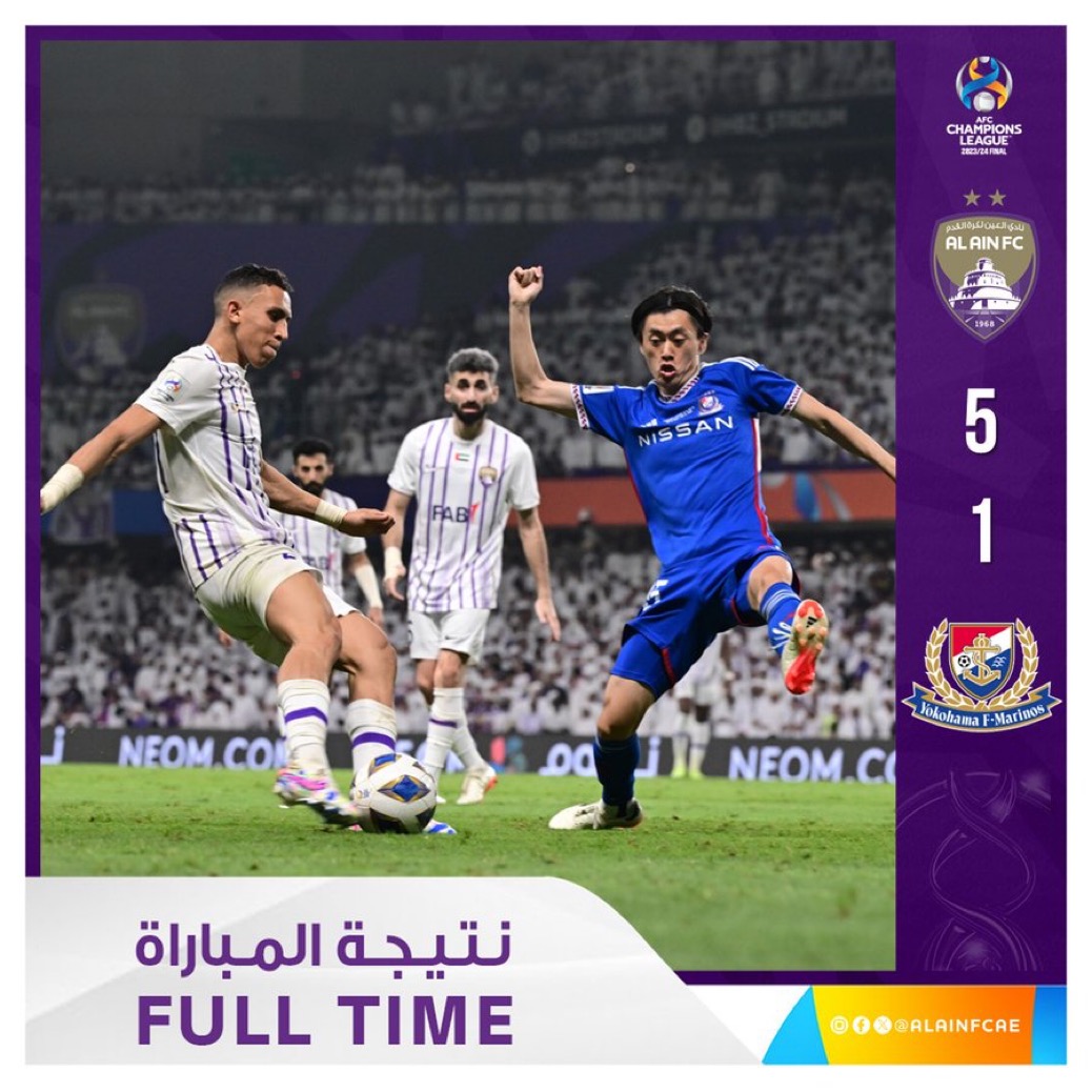 توج نادي العين الإماراتي بكأس آسيا للمرة الثانية في تاريخه بعد الفوز واكتساح ضيفه نادي يوكوهاما مارينوس الياباني بخماسية مقابل هدف في نهائي دوري أبطال آسيا.