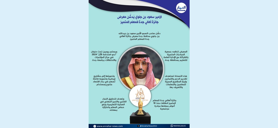 دشّن صاحب السمو الأمير سعود بن عبدالله بن جلوي محافظ جدة اليوم، معرض جائزة أهالي جدة للمعلم المتميز بعنوان "نحو استدامة الأثر" 2024، الذي تنظمه جمعية المبادرات المتميزة بالشراكة مع الإدارة العامة للتعليم بمحافظة جدة، بحضور معالي رئيس جامعة جدة الدكتور عدنان بن سالم الحميدان، ومعالي رئيس جمعية المبادرات المتميزة غسان بن أحمد السليمان، وعدد من قيادات الإدارة العامة للتعليم بمحافظة جدة، ويستمر يومين ، وذلك في مركز المؤتمرات والاحتفالات بجامعة جدة.