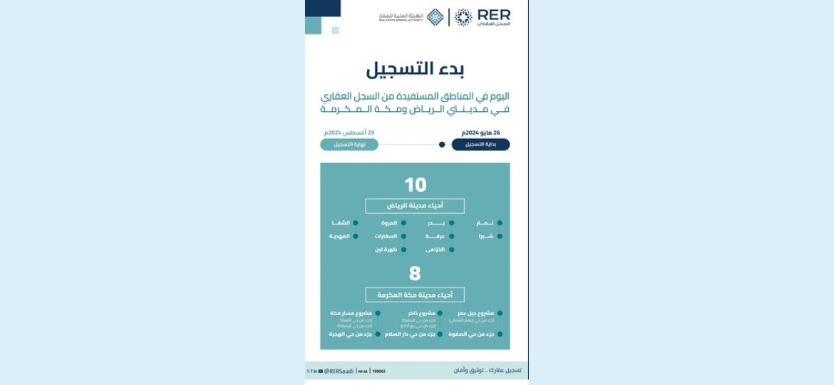 أعلنت الهيئة العامة للعقار بدء التسجيل في 7 مناطق عقارية، تشمل 18 حيًّا في مدينتي الرياض ومكة المكرمة، ويستمر التسجيل حتى نهاية يوم 25 صفر 1446هـ الموافق 29 أغسطس 2024م.