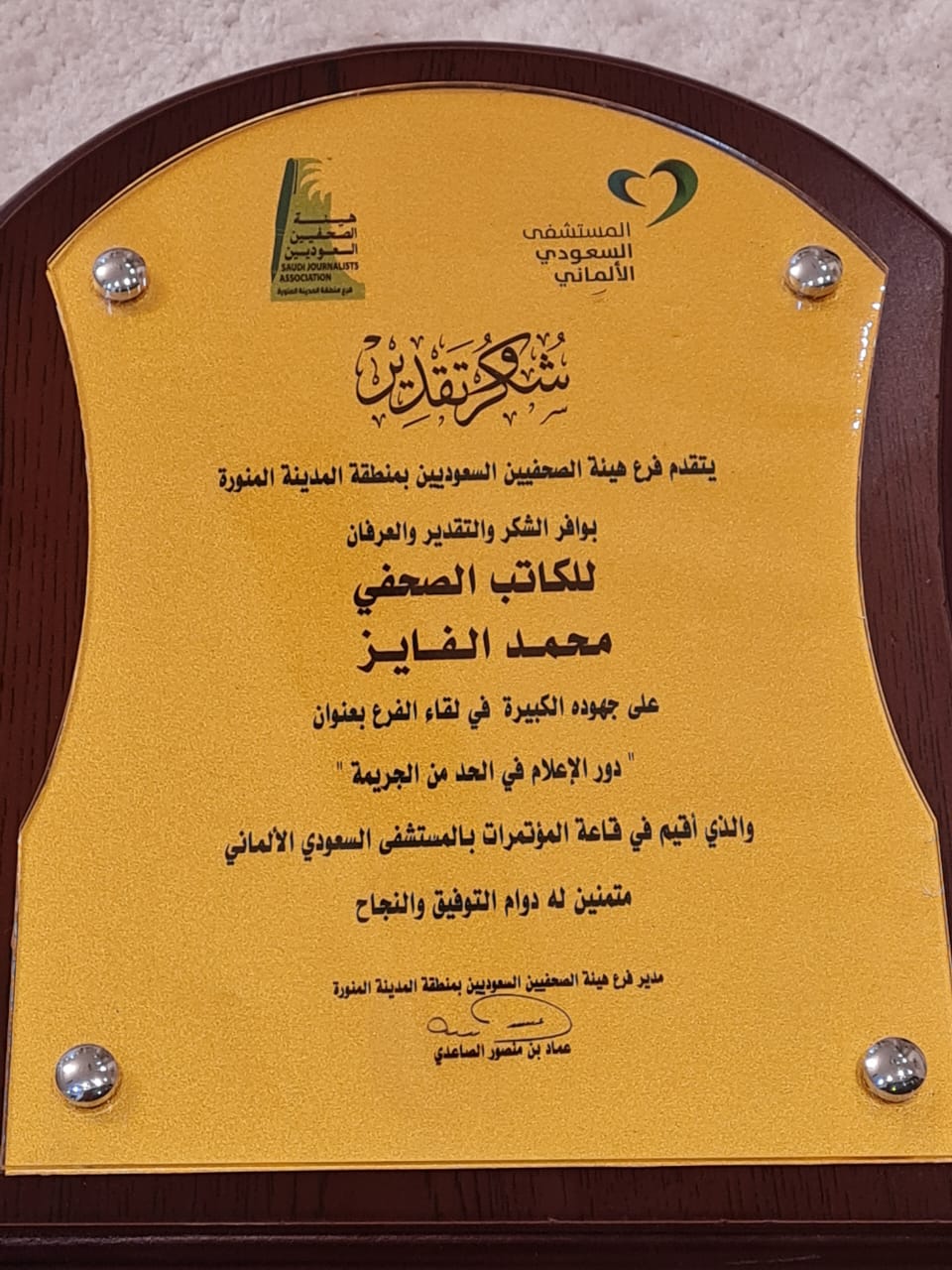 كرم فرع هيئة الصحفيين السعوديين بالمدينة المنورة، الإعلامي الكاتب بصحيفة النهار السعودية، الأستاذ محمد الفايز، نظير جهوده الكبيرة في لقاء الفرع، والذي أقيم بعنوان "دور الإعلام في الحد من الجريمة".