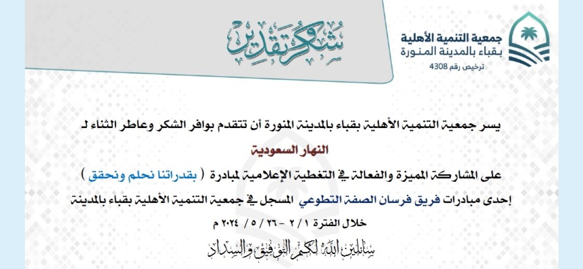 تقدمت جمعية التنمية الأهلية بقباء في المدينة المنورة بالشكر إلى صحيفة "النهار" السعودية على مشاركتها المميزة والفعالة في التغظية الإعلامية لمبادرة (بقدراتنا نحلم ونحقق) إحدى مبادرات فريق فرسان الصفة التطوعي.