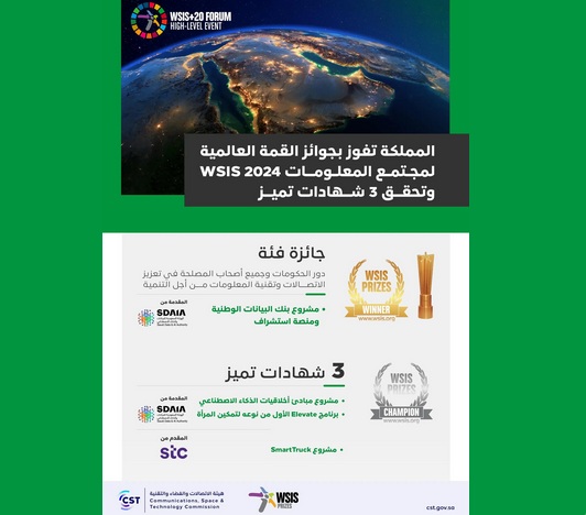 وحققت المملكة الفوز بالجائزة في فئة دور الحكومات وجميع أصحاب المصلحة في تعزيز الاتصالات وتقنية المعلومات، من أجل التنمية عن مشروع بنك البيانات الوطنية ومنصة استشراف، المقدم من الهيئة السعودية للبيانات والذكاء الاصطناعي (سدايا)، الذي يهدف إلى تحسين جودة البيانات في المملكة وتعزيز مشاركتها بين الجهات والإسهام في بناء اقتصاد رقمي قائم على البيانات عبر منصات مخصصة. كما حققت المملكة ثلاث شهادات تميز عن مشروع مبادئ أخلاقيات الذكاء الاصطناعي المقدم من (سدايا) والذي يهدف إلى تطوير الاعتبارات الأخلاقية وضمان تنفيذها طوال دورة حياة أنظمة الذكاء الاصطناعي، وبرنامج Elevate المقدم من (سدايا) الذي يعد الأول من نوعه لتمكين المرأة وتدريبها في مجالات البيانات والذكاء الاصطناعي، حيث تم تدريب أكثر من 1000 امرأة من 28 دولة منذ إطلاق البرنامج، بالإضافة إلى مشروع SmartTruck المقدم من شركة الاتصالات السعودية (STC) بالتعاون مع هواوي الذي يهدف إلى سد الفجوة الرقمية لدى كبار السن من خلال تقديم برامج تدريبية للمهارات الرقمية.
