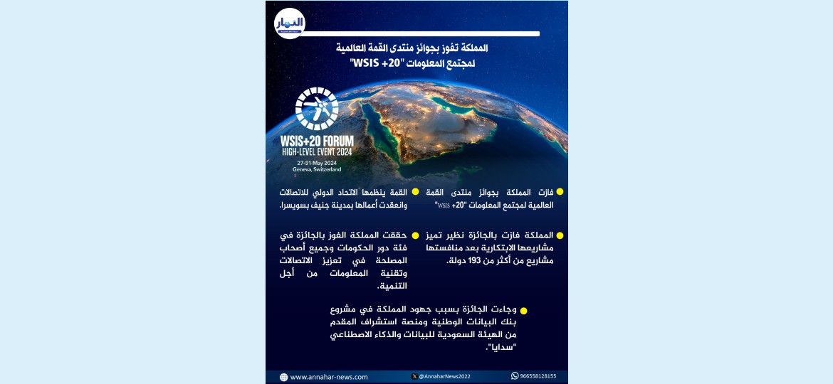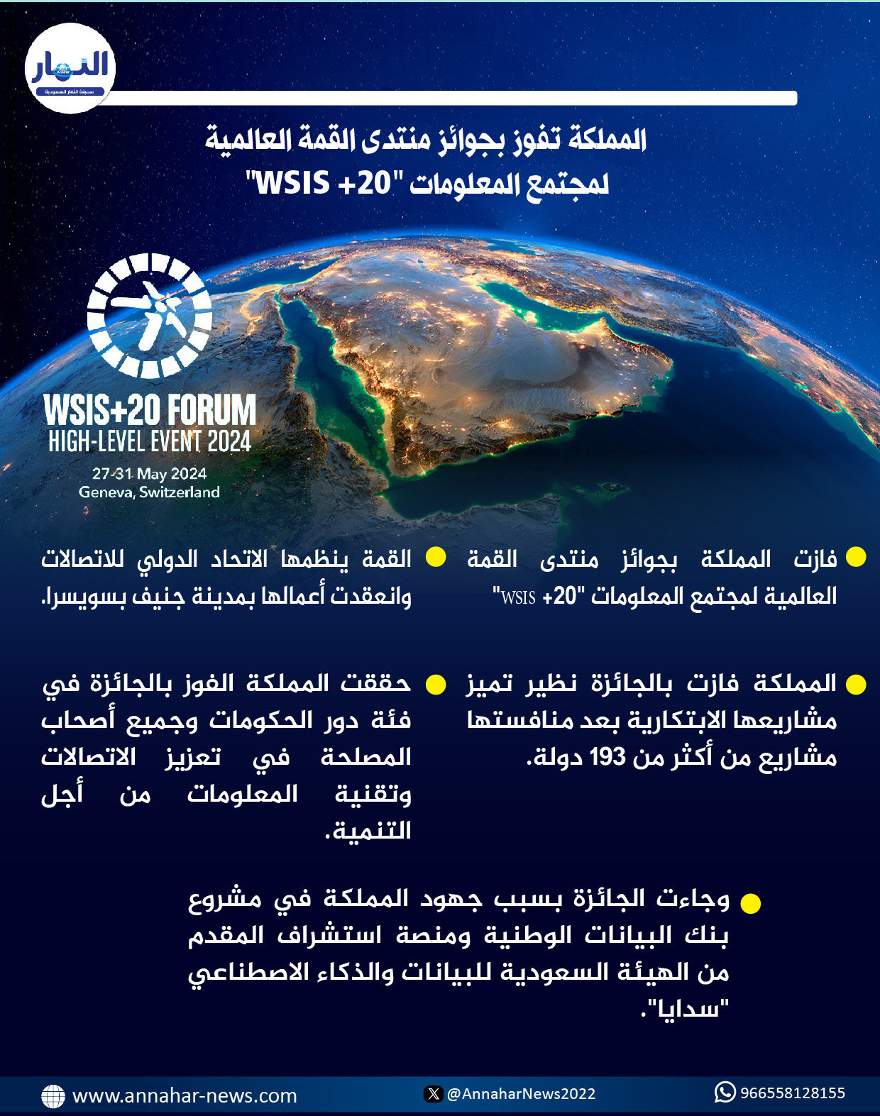 فازت المملكة بجوائز منتدى القمة العالمية لمجتمع المعلومات "WSIS +20" التي ينظمها الاتحاد الدولي للاتصالات، وانعقدت أعمالها بمدينة جنيف بسويسرا، وذلك نظير تميز مشاريعها الابتكارية بعد منافستها مشاريع من أكثر من (193) دولة.