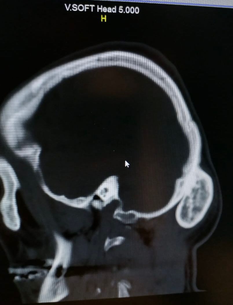 وقال الفريق الطبي ب‘نه فور وصول المريض أجريت له كامل الفحوصات المخبرية والمقطعية على المخ وأشعة ثلاثية الابعاد حيث تبين وجود ورم حميد في القشرة الخارجية من عظام الجمجمة.