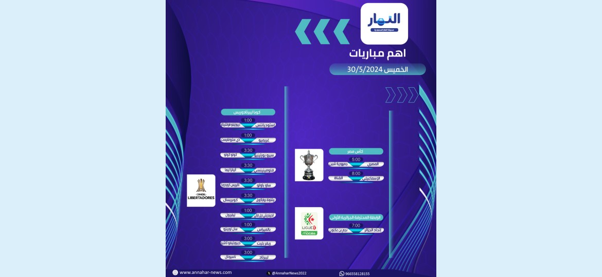 يحرص عشاق ومحبو كرة القدم على معرفة جدول مواعيد مباريات يوم غدًا الخميس 30 مايو 2024م، في مختلف دوريات العالم، حيث تشهد العديد من المباريات، وبطولات الكؤوس المحلية، وبطولة الدوري الأمريكي، ودوري السوبر المصري لكرة السلة.