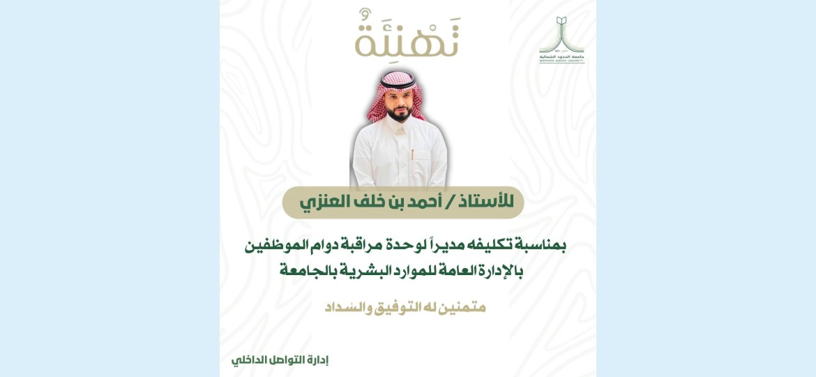 صدر قرار تكليف الأستاذ أحمد بن خلف العنزي مديراً وحدة مراقبة دوام الموظفين بجامعة الحدود الشمالية.