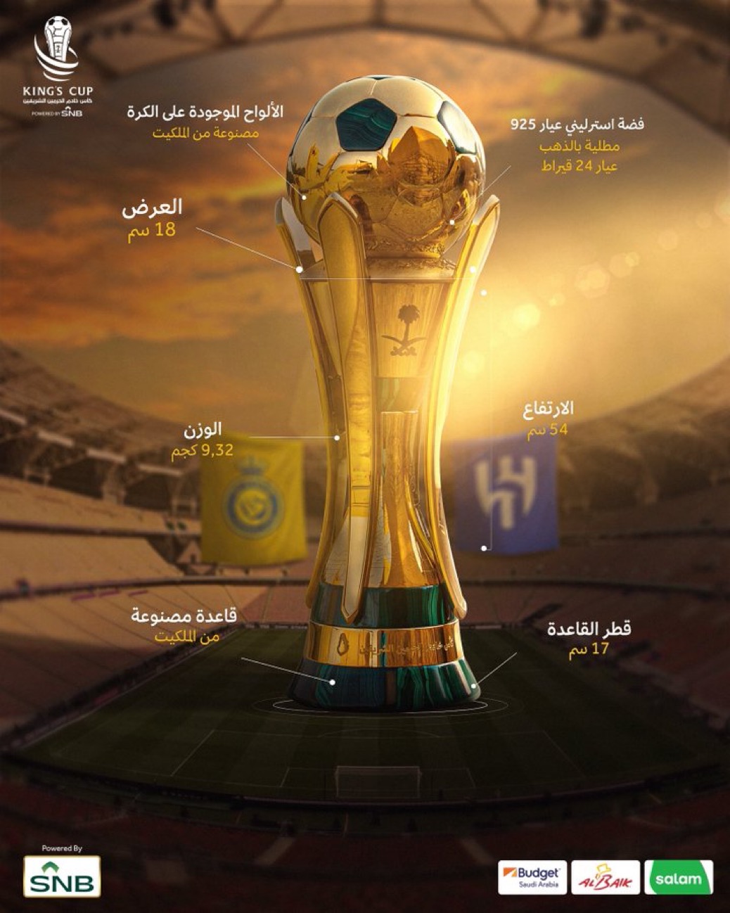 ويعتلي الكأس كرة قدم مطلية بالذهب الخالص ومادة الملكيت، وتنحدر منها 4 مقابض مميزة، وفي المنتصف يوجد شعار السيفين والنخلة التي ترمز إلى المملكة العربية السعودية، بالإضافة إلى نقش اسم الكأس يدويًا بشكلٍ دائري، في حين يبلغ ارتفاع الكأس 54 سم، وقُطر القاعدة 17 سم، وعرض 18 سم، وفي الأسفل تتشكل قاعدة مصنوعة من الرخام مع مادة الملكيت.