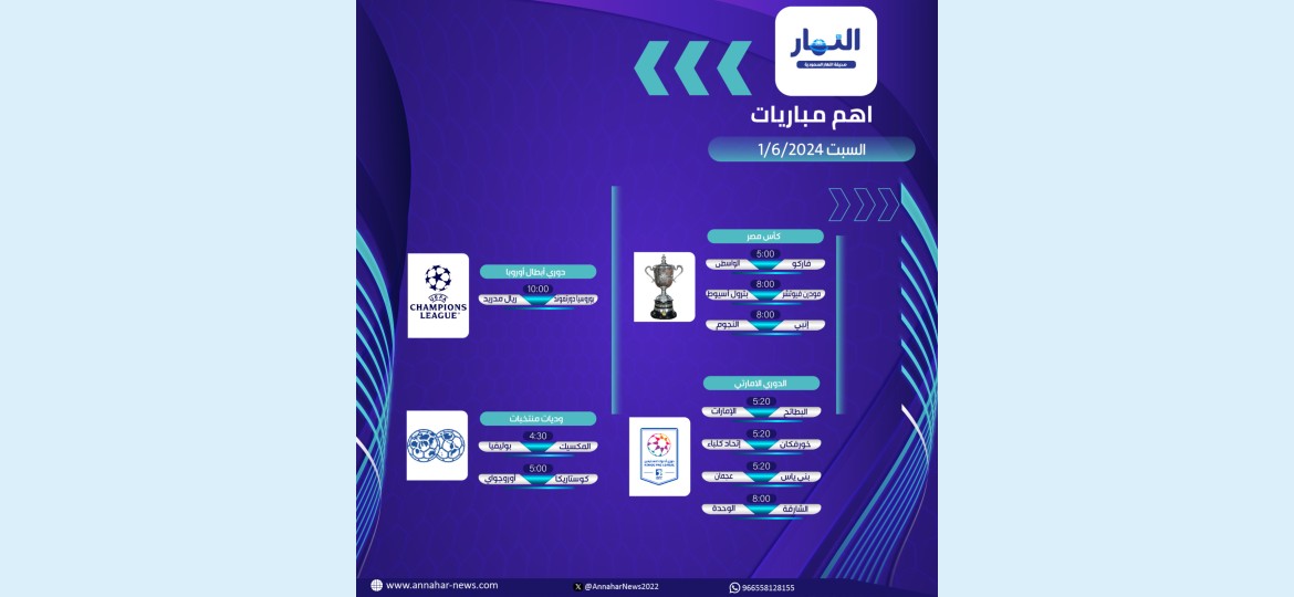 وفي إطار خدماته التي تقدمها صحيفة النهار السعودية لقرائها من متابعي رياضة كرة القدم، ستعرض جدول مباريات اليوم السبت، والذي يتمثل في التالي: