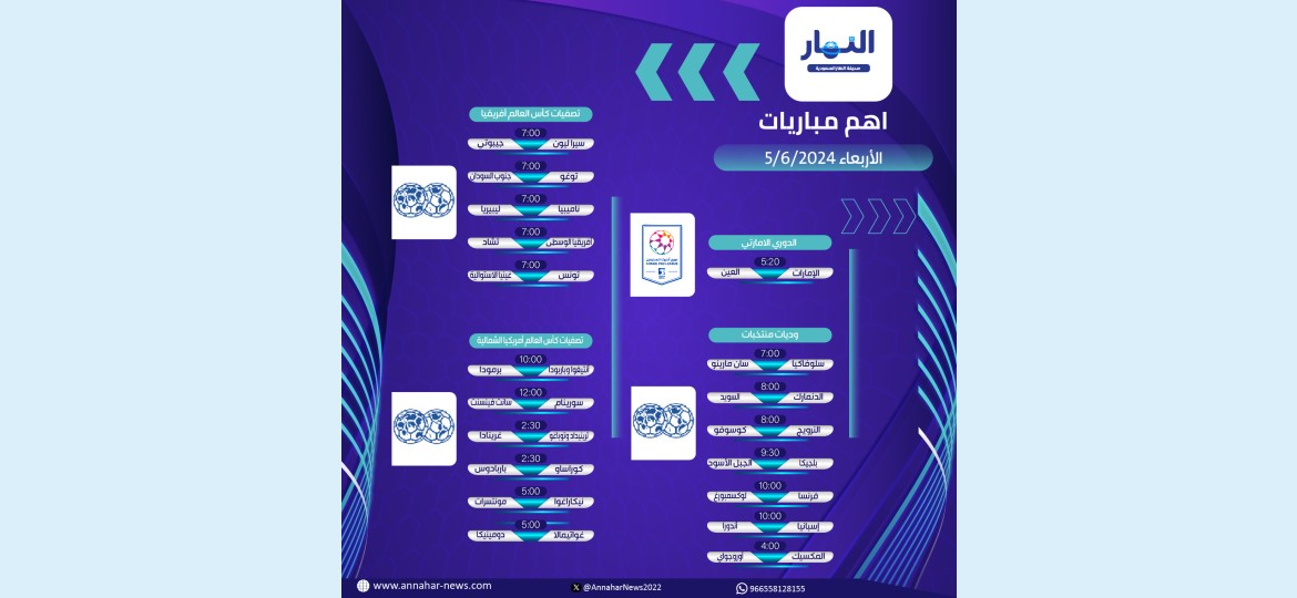 يحرص عشاق ومحبو كرة القدم على معرفة جدول مواعيد مباريات اليوم الأربعاء 5 مايو 2024م، في الدوري الإماراتي، والتصفيات الإفريفية المؤهلة لكأس العالم 2026م، بالإضافة إلى مباريات دولية ودية.