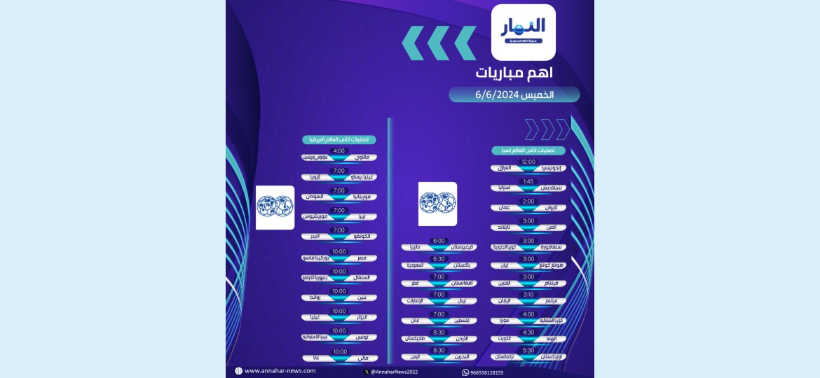 وتستعرض "صحيفة النهار السعودية" جدول مواعيد المباريات المزمع إقامتها يوم غدًا الخميس: