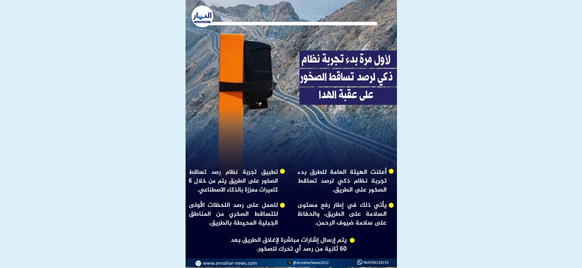 أعلنت الهيئة العامة للطرق، البدء في تجربة نظام ذكي لرصد تساقط الصخور على الطريق، وذلك بحضور معالي وزير النقل والخدمات اللوجستية رئيس مجلس إدارة الهيئة العامة للطرق المهندس صالح بن ناصر الجاسر.
