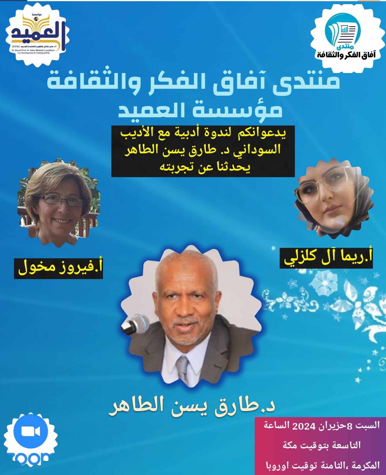 تقام مساء اليوم السبت 8 يونيو ندوة أدبية في تمام الساعة التاسعة مساءاً بتوقيت مكة المكرمة الثامنة بتوقيت أوروبا (عن بعد) للأديب الشاعر السوداني الأستاذ طارق ياسين الطاهر، يتحدث فيها عن تجربته مع الشعر تحت رعاية منتدى أفاق الفكر والثقافة بالتعاون مع مؤسسة العميد للتطوير والتنمية والتدريب وسوف يحاوره بكل إقتدار الأديبة الشاعرة ريما ال كلزلي، ومن السويد الأديبة والشاعرة العربية السويدية الأستاذة فيروز مخول، السورية الأصل فهذه دعوة للمهتمين بالثقافة والأدب لمتابعة هذه الأمسية التي بلاشك سوف تكون ماتعة من الأديب الشاعر والمحاورتان البارعتان الأستاذة ريما كاتبة وروائية وشاعرة ومعها الأديبة الأستاذة فيروز وسوف تكون الندوة عبر رابط الزوم https://us06web.zoom.us/j/85072131258?pwd=2EQiRk8Gcq9r505O8UuDAqRnDqlKgU.1 كذلك سوف تبث مباشر عبر منصة الفيسبوك وكذلك خدمة اليوتيوب
