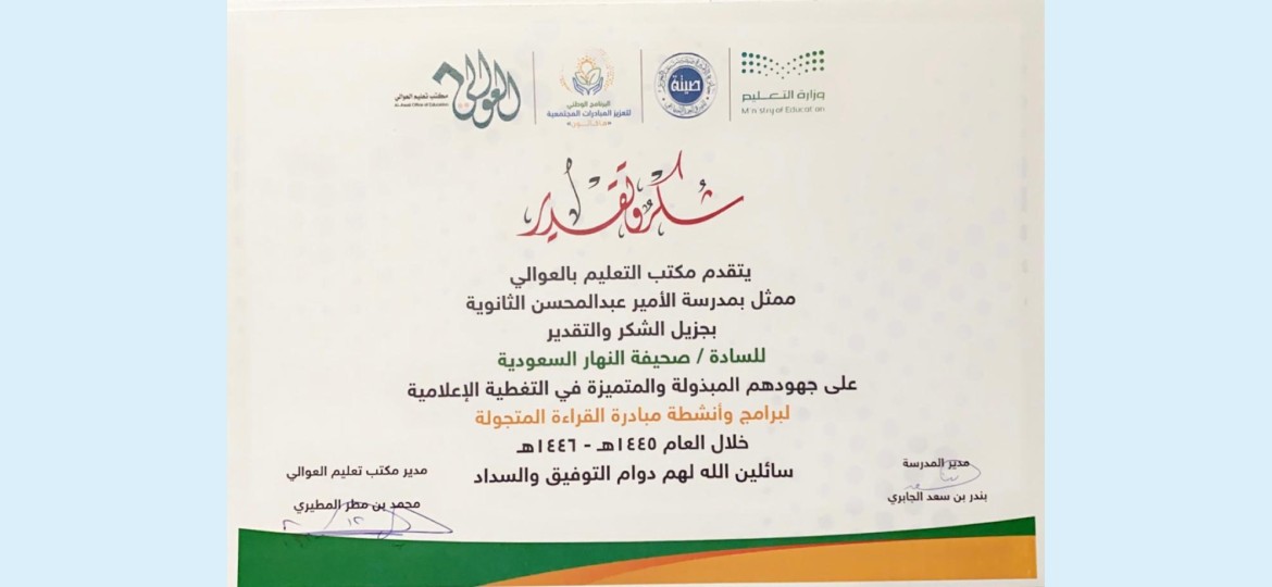 تقدم مكتب التعليم بالعوالي ممثلًا بمدرسة الأمير عبد المحسن الثانوية، لصحيفة النهار السعودية على جهدها المبذول والمتميز في التغطية الإعلامية لبرامج وأنشطة مبادرة القراءة المتجولة خلال العام 1445 هـ - 1446 هـ.