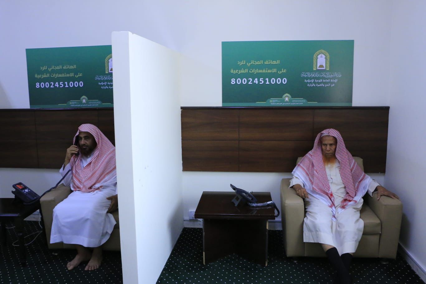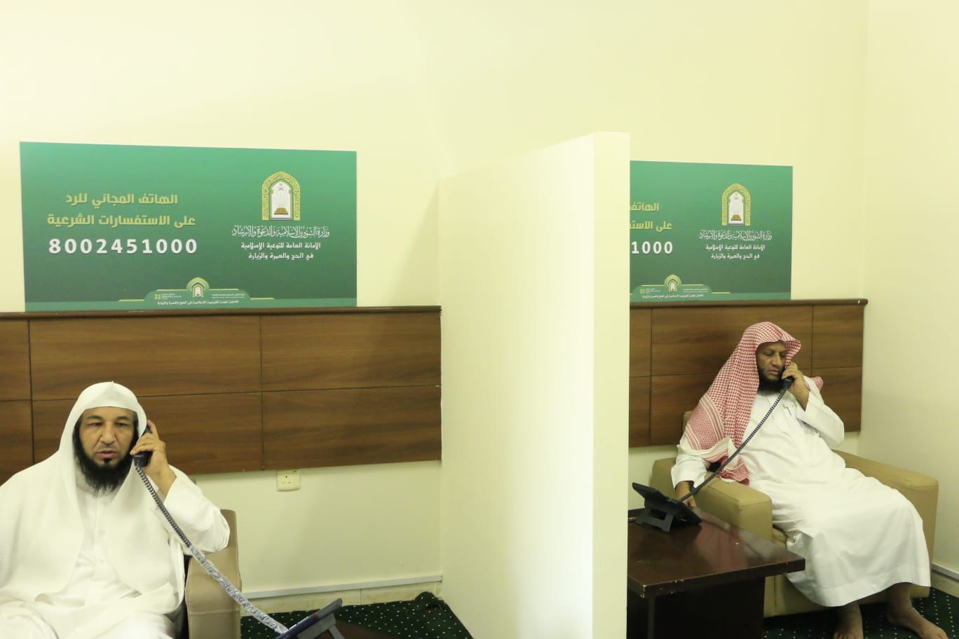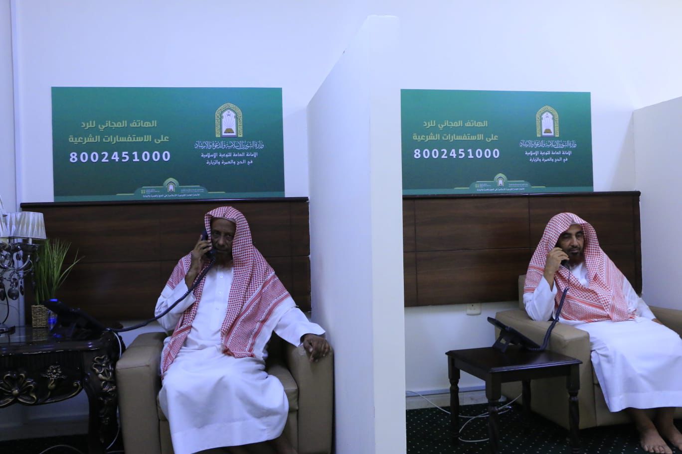 ويشارك في إجابة أسئلة المتصلين من خلال الهاتف المجاني (8002451000) نخبة من دعاة الوزارة حيث تم اختيارهم بدقة وعناية وهم من أهل العلم و الدراية التامة بمناسك الحج والعمرة وفق الكتاب والسنة دون تشدد ولا تكلف مع توفر مترجمين بلغات عالمية، حيث يستقبل الهاتف المجاني المكالمات على مدار الساعة.