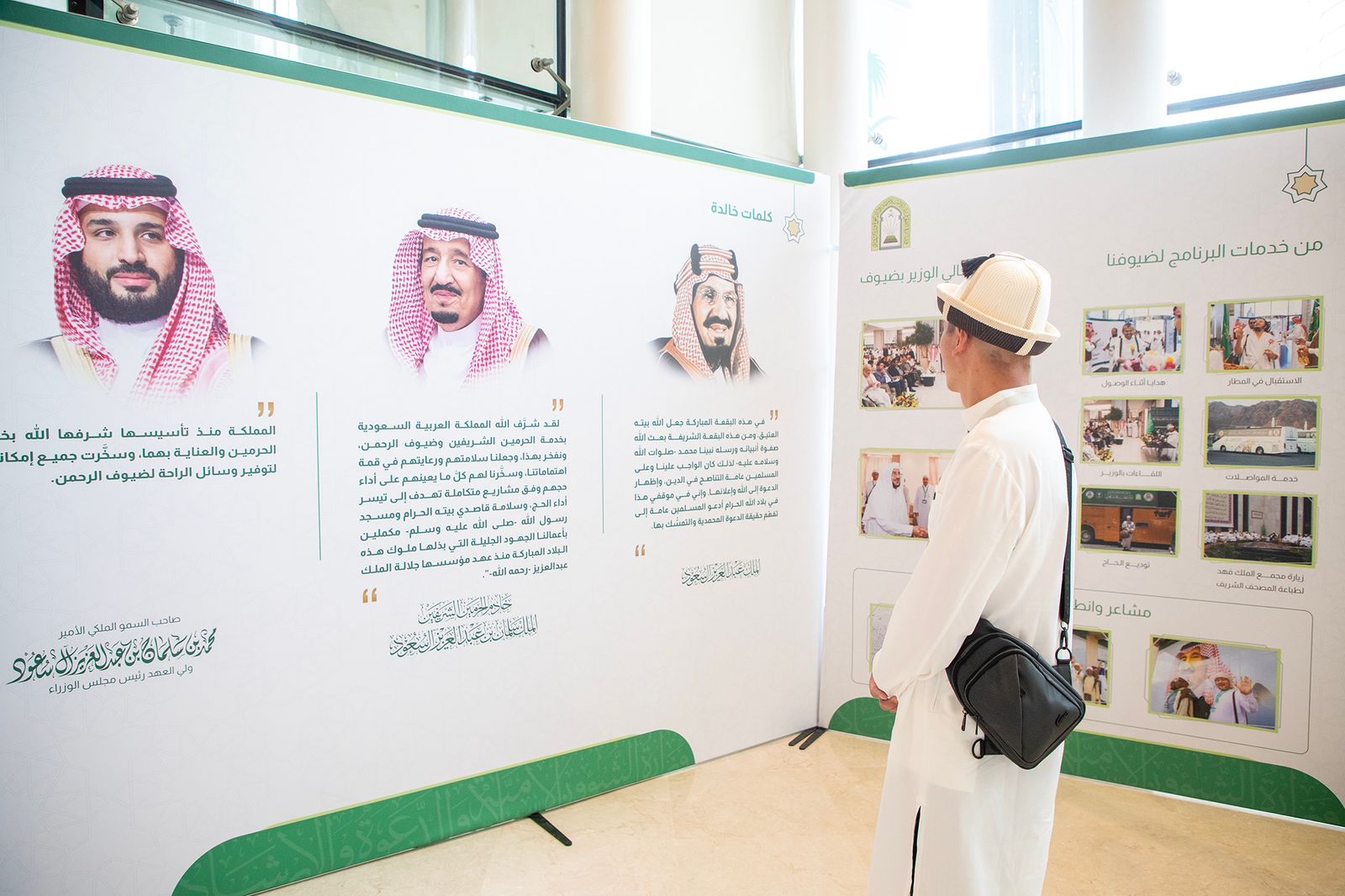 استوقفت جداريات معرض وزارة الشؤون الإسلامية والدعوة والإرشاد بمقر استضافة برنامج ضيوف خادم الحرمين الشريفين للحج والعمرة والزيارة والتي تزينت بصور الملك المؤسس عبدالعزيز -طيّب الله ثراه- وخادم الحرمين الشريفين وسمو ولي عهده الأمين -حفظهما الله- وأقوالهم الخالدة, أحد ضيوف البرنامج الذي وقف احتراماً وتقديرا للقيادة الرشيدة على جهودها العظيمة في خدمة الحجاج والمعتمرين.