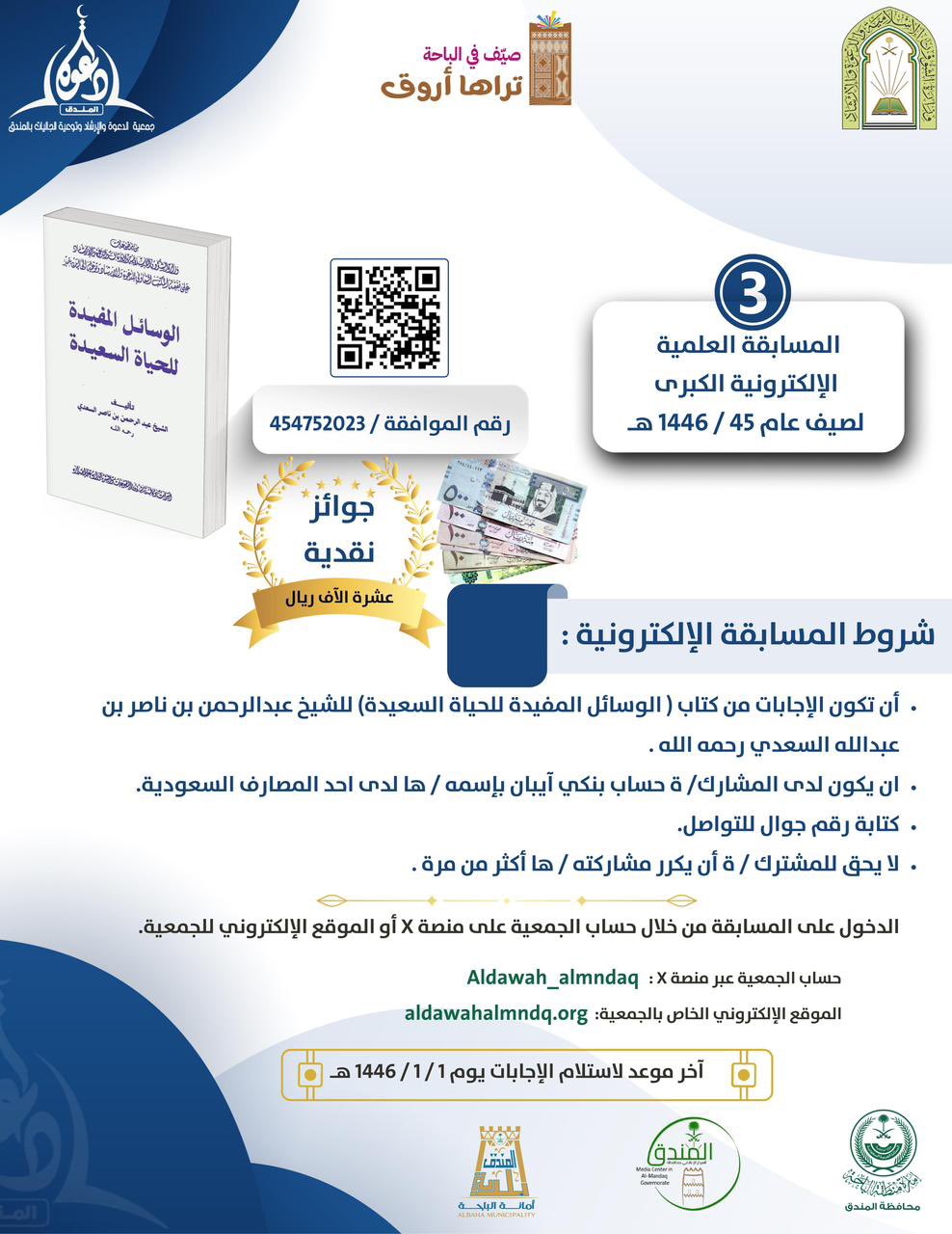 دشن محافظ المندق أ. قاسم بن سعيد آل محسن، المسابقة العلمية الإلكترونية الكبرى في كتاب ( الوسائل المفيدة للحياة السعيدة) للشيخ العلامة / عبدالرحمن بن ناصر بن عبدالله السعدي رحمه الله، والتي تنظمها جمعية الدعوة والارشاد وتوعية الجاليات بالمندق.
