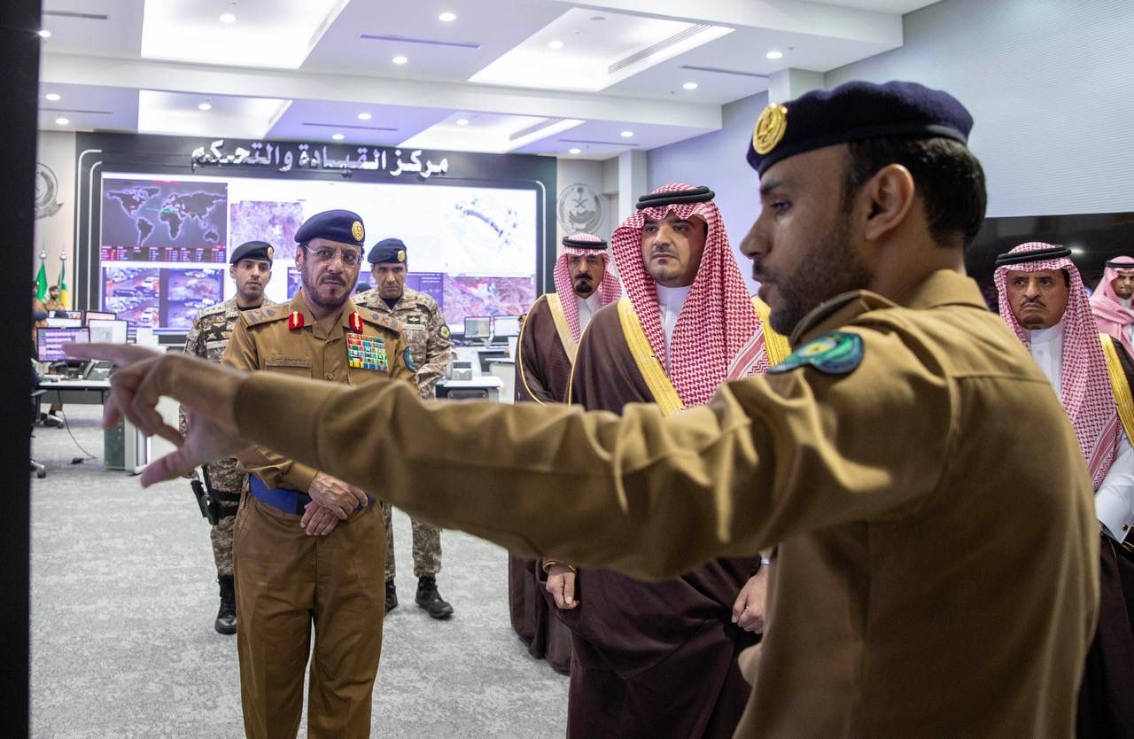 تابع صاحب السمو الملكي الأمير عبدالعزيز بن سعود بن نايف بن عبدالعزيز وزير الداخلية رئيس لجنة الحج العليا، اليوم، سير العمل في مركز القيادة والتحكم التابع للدفاع المدني بمشعر منى.