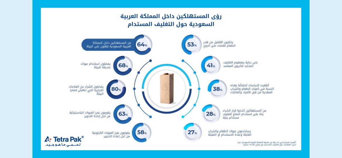 أعلنت شركة تتراباك اليوم عن استنتاجات الدراسة العالمية عن التغليف المستدام التي أجرتها مؤخراً، والتي يمكن أن تؤثر على تعزيز ممارسات الاستدامة في المملكة العربية السعودية. تهدف هذه الدراسة إلى فهم الخطوات التي يتخذها المستهلكون للحفاظ على البيئة في المملكة، ومن ثم تحديد الاتجاهات الجديدة في الأسواق المحلية، والفرص والتحديات المتعلقة بالاستدامة، وتزويد الشركات بمعلومات قيمة قائمة على البيانات لمساعدتها في تطوير حلول الاستدامة لتلبية مطالب المستهلكين بشكل أفضل.