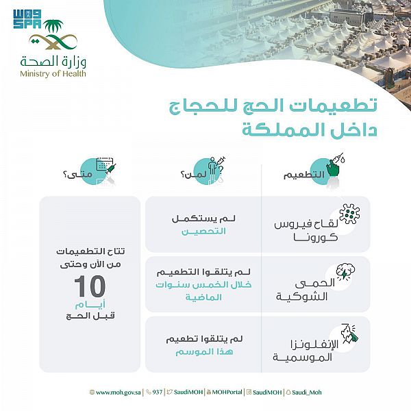 أكدت وزارة الصحة على الراغبين في أداء مناسك الحج لهذا العام 1444هـ من الداخل بضرورة الإسراع في أخذ لقاحي الحمى الشوكية، والإنفلونزا الموسمية واستكمال التحصين للقاحات فيروس كورونا.
