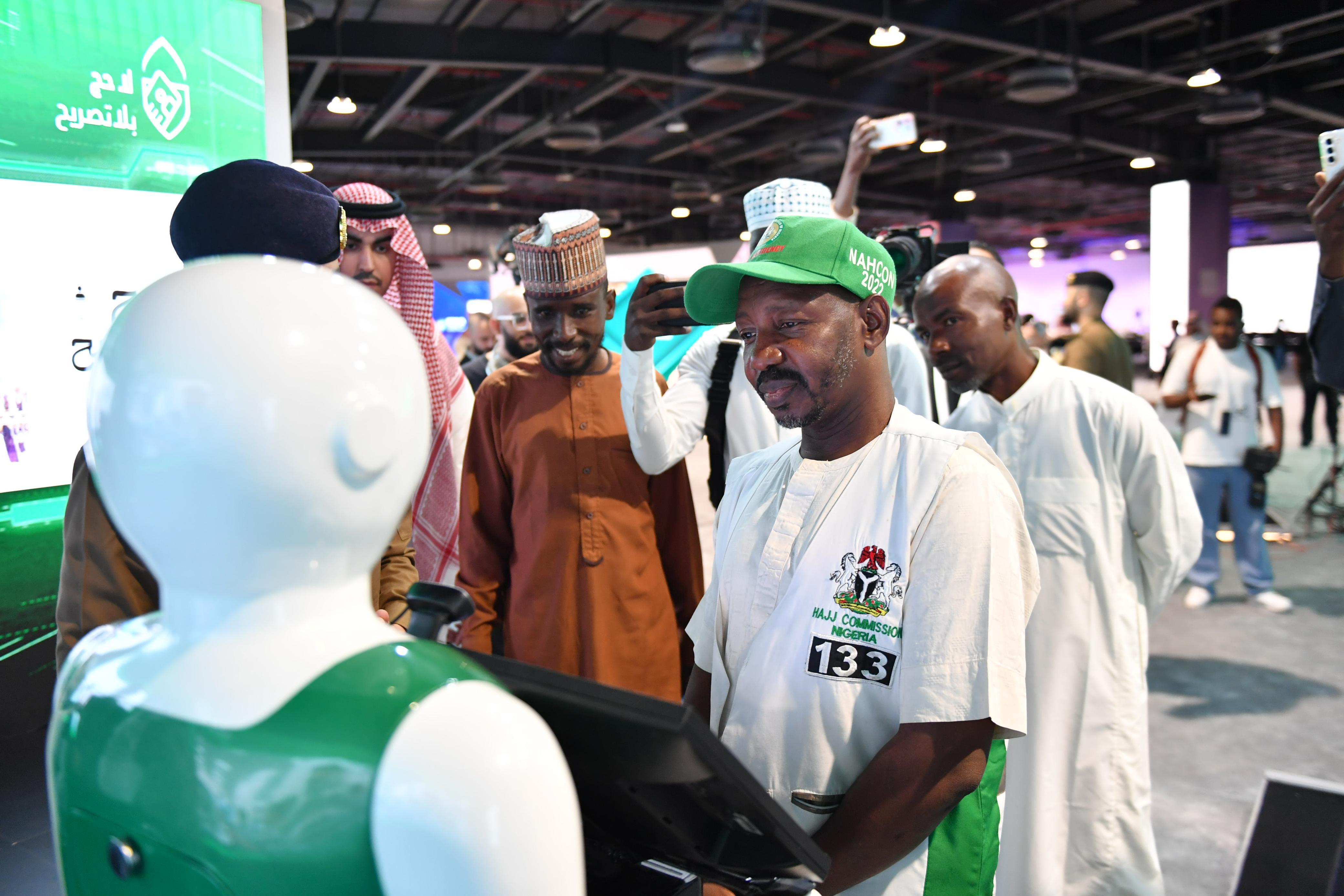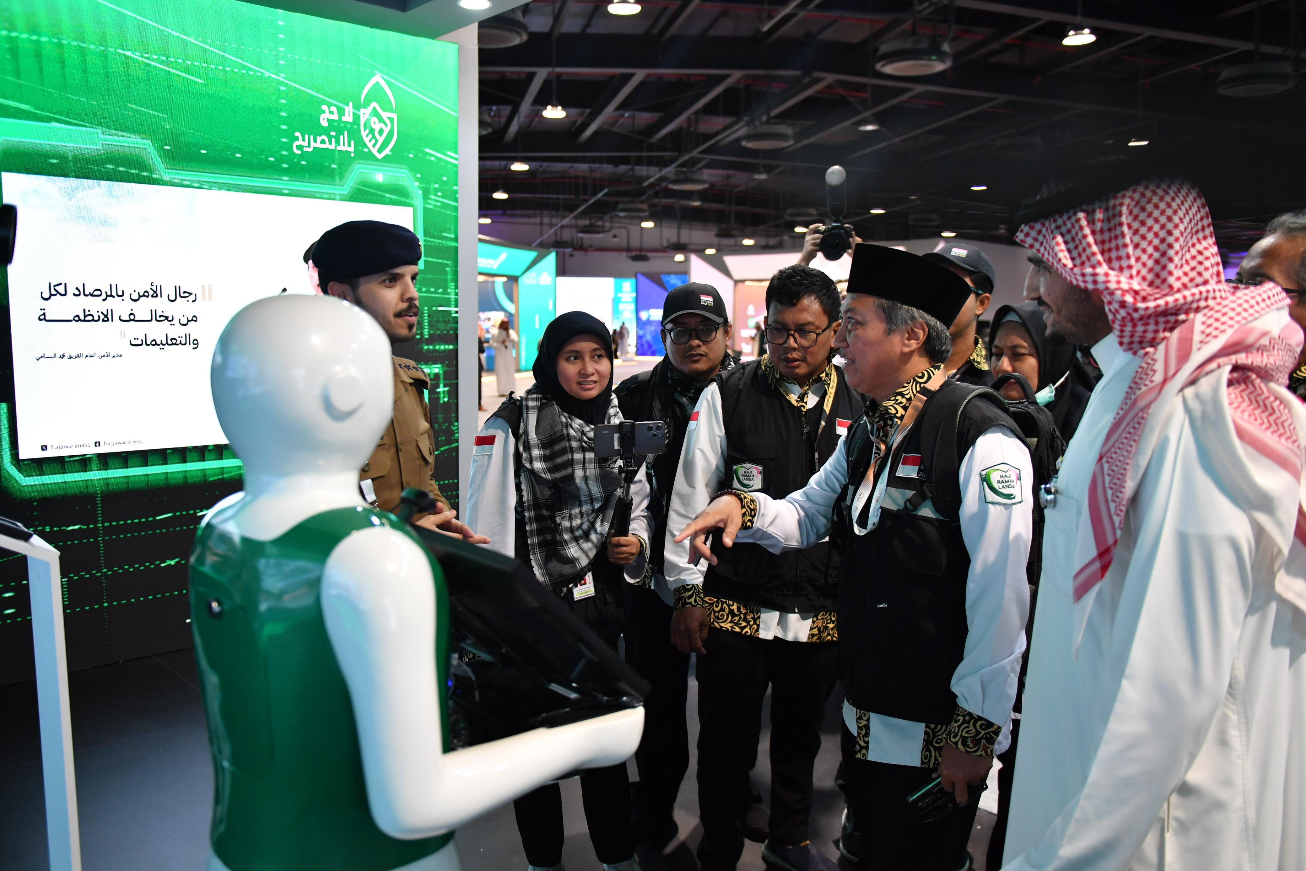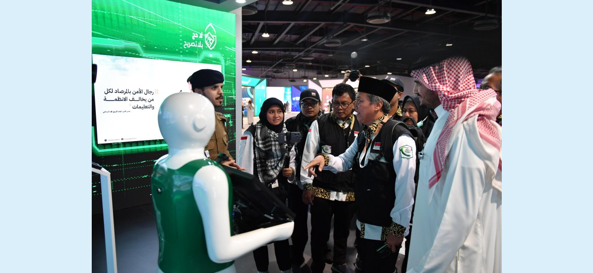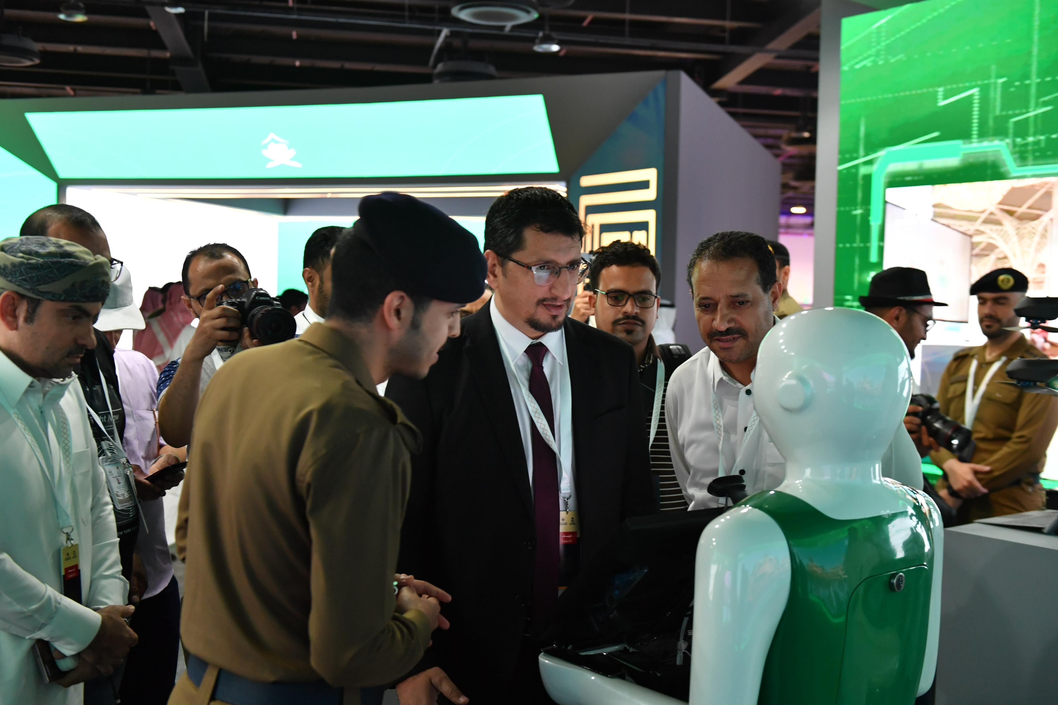 وجذب الروبوت انتباه مرتادي جناح وزارة الداخلية، للترحيب بالزوار والتعریف بالخدمات المقدمة لتعزيز مستوى الوعي بأهمية السلامة والوقاية من المخاطر في المواقع ومقار سكن الحجاج في مكة المكرمة والمشاعر المقدسة.