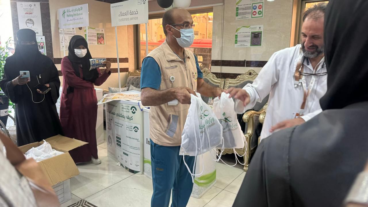 ضمن جهود وزارة الصحة وبالتعاون مع إمارة منطقة مكة المكرمة ووزارة الحج والعمرة، فعلت مديرية الشئون الصحية بمنطقة مكة المكرمة برنامج سفراء التوعية والتثقيف الصحي لاستهداف مساكن الحجاج بالعاصمة المقدسة بهدف رفع الوعي الصحي تجاه مخاطر الإجهاد الحراري وتفادي ضربات الشمس مع توزيع حقائب صحية تشتمل على مظلات شمسية وقطاره ومعقم وبروشور تثقيفي.