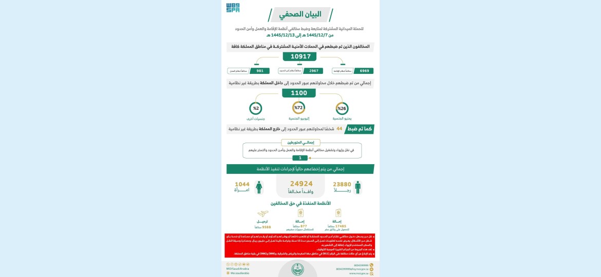 أسفرت الحملات الميدانية المشتركة لمتابعة وضبط مخالفي أنظمة الإقامة والعمل وأمن الحدود، التي تمت في مناطق المملكة كافة، وذلك للفترة من 07 / 12 / 1445 هـ الموافق 13 / 06 / 2024 م إلى 13 / 12 / 1445هـ الموافق 19 / 06 / 2024م، عن النتائج التالية: