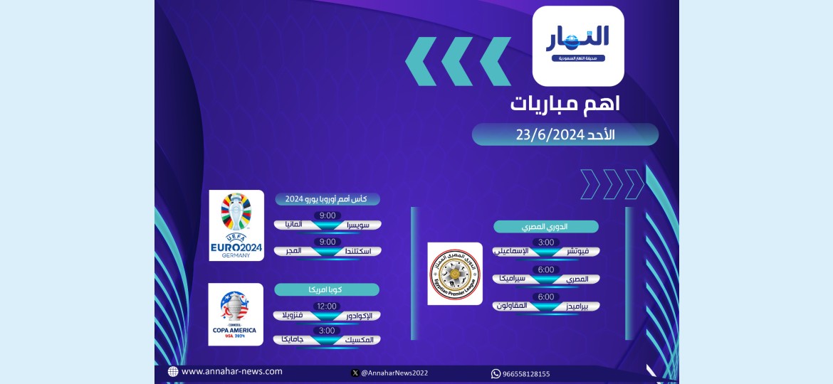 وفي إطار خدماتها الإخبارية التي تقدمها صحيفة "النهار السعودية، تستعرض مواعيد مباريات الأحد 23 يونيو إقليمًا وعالميًا، والتي تتمثل في التالي: