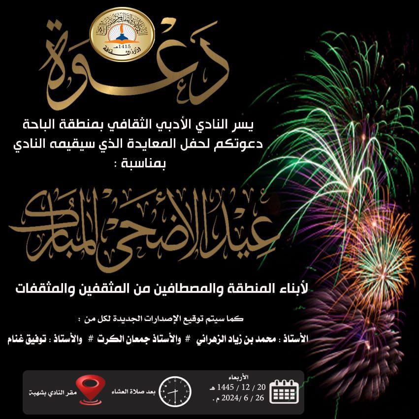 يقيم نادي الباحة الأدبي الثقافي حفل المعايدة السنوي الذي يحتضنه النادي يوم الأربعاء المقبل الموافق 20-12-1445هـ، بعد صلاة العشاء والذي يلتقي فيه أبناء المنطقة والمصطافين