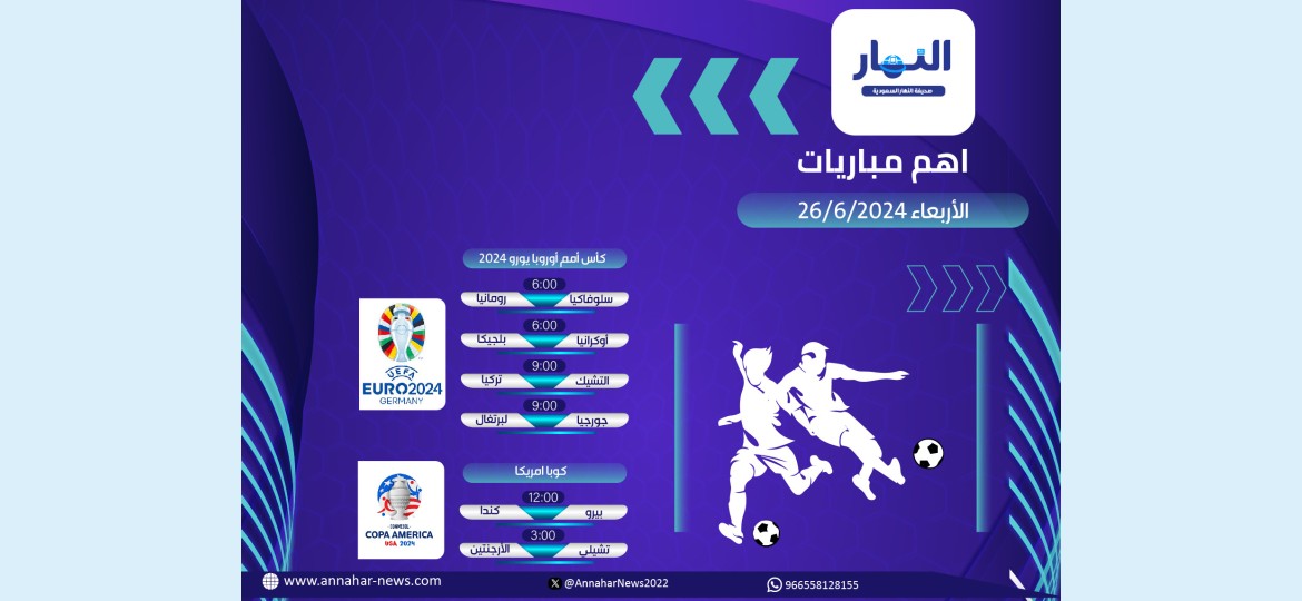 يشهد اليوم الأربعاء 26 يونيو 2024 العديد من المواجهات النارية على الصعيد العالمي، حيث تُقام اليوم في إطار بطول أمم أوروبا عدة مباريات ينتظرها عشاق الساحرة المستديرة.