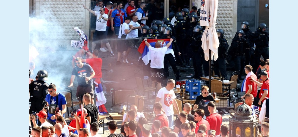 أصيب 10 أشخاص على الأقل، من بينهم 9 أفراد شرطة، بجروح طفيفة خلال اشتباكات مع مشجعين لمنتخب صربيا في وسط مدينة ميونخ الألمانية، وذلك قبل مواجهة دور المجموعات في بطولة "يورو 2024" بين الدنمارك وصربيا، حسبما ذكرت الشرطة في ساعة مبكرة من صباح اليوم الأربعاء.