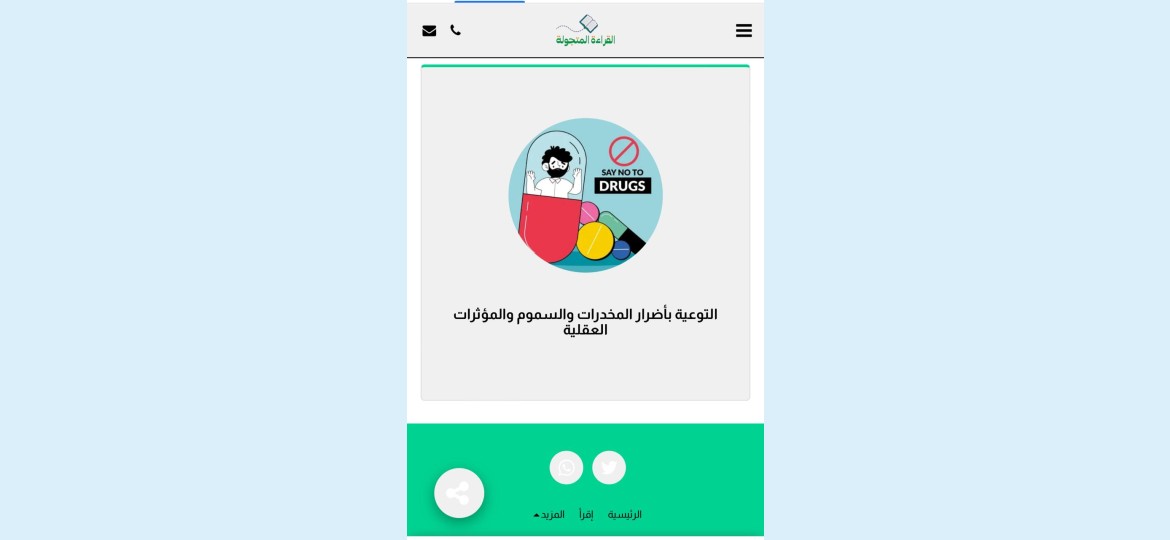 تشارك المكتبة الإلكترونية لمبادرة القراءة المتجولة في اليوم العالمي لمكافحة المخدرات الذي يوافق الـ (26) من يونيو كل عام لنشر وزيادة الوعي بأضرار المخدرات وخطورتها الناتجة عن تعاطيها، من خلال تخصيص قسم خاص بالتوعية والتثقيف بالموقع الإلكتروني لمبادرة القراءة المتجولة التي ينفّذها فريق بواسل المدينة التطوعي بثانوية الأمير عبدالمحسن بن عبدالعزيز، والتي أطلقت ضمن إطار البرنامج الوطني لتعزيز المبادرات الاجتماعية لمؤسسة الأميرة صيتة للتميز في العمل الاجتماعي ( هاكاثون) بإشراف تعليم المدينة المنورة.