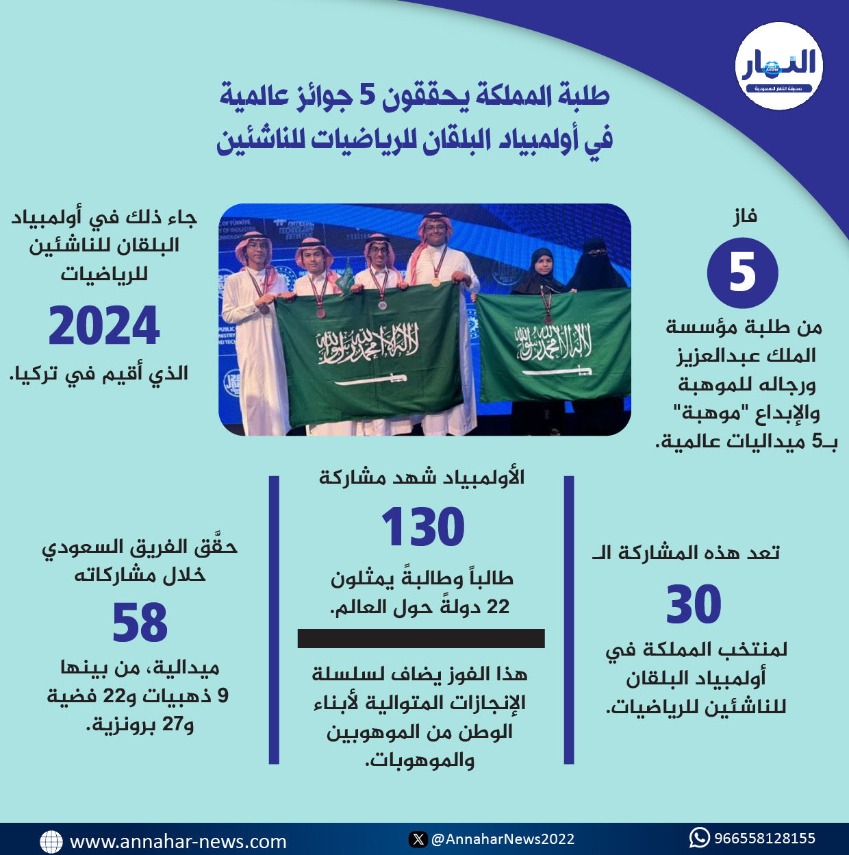 حقَّق 5 طلبة سعوديين من طلبة مؤسسة الملك عبدالعزيز ورجاله للموهبة والإبداع "موهبة"، بالشراكة مع وزارة التعليم، إنجازاً عالمياً بفوزهم بـ5 ميداليات، (فضية، و4 ميداليات برونزية)، في أولمبياد البلقان للناشئين للرياضيات 2024 (JBMO2024)، الذي أقيم في الجمهورية التركية، في دورته الـ28 التي أقيمت خلال الفترة من 25 إلى 30 يونيو، بمشاركة 130 طالباً وطالبةً يمثلون 22 دولةً.