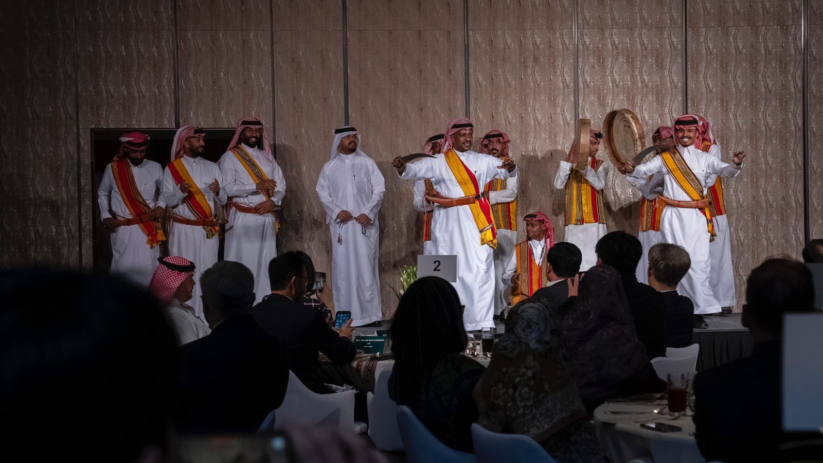 وتميزت ليلة العشاء السعودي بعزف موسيقي، وعرض حي للفنون الأدائية السعودية، إلى جانب تقديم أطباق متنوعة؛ تشمل كبيبة حائل، والكبسة الحساوية، والجريش، والمرقوق، وغيرها من المأكولات، إلى جانب تقديم الضيافة والقهوة السعودية.