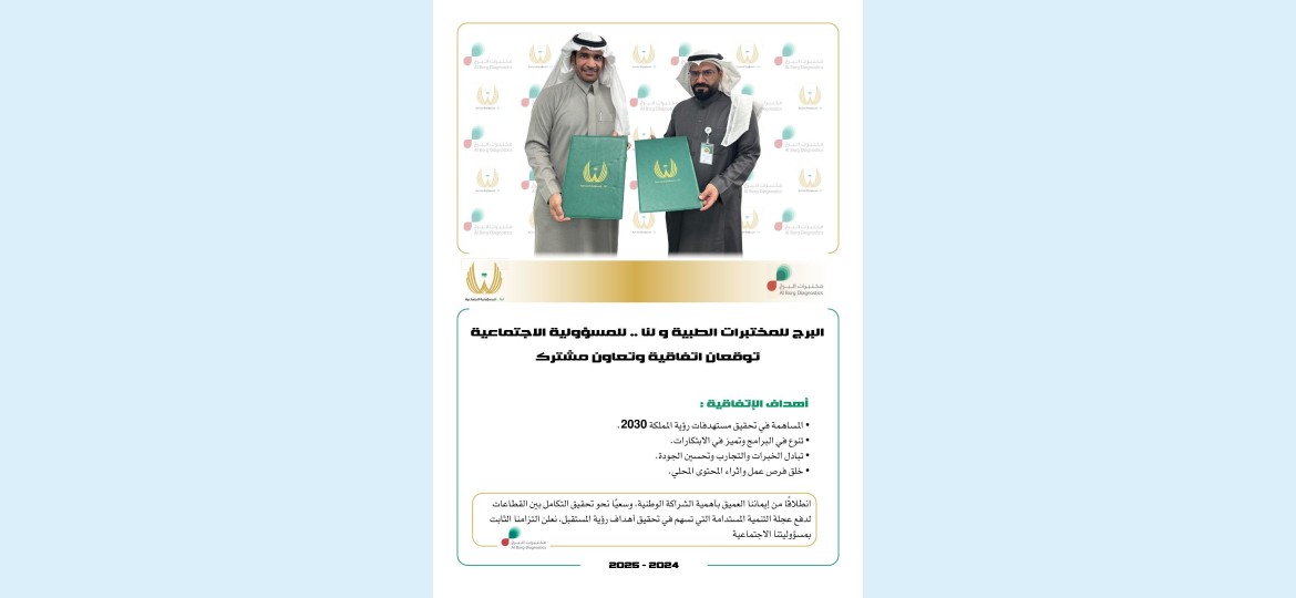 وتأتي هذه الاتفاقية ضمن اهتمام شركة البرج للمختبرات الطبية بالمسؤولية الاجتماعية (CSR) والمساهمة في تحقيق مستهدفات رؤية المملكة 2030، ومواكبة مرحلة التحول النوعي الذي تشهده كافة القطاعات والقطاع الصحي على وجه الخصوص في ظل الدعم اللامحدود الذي توليه الحكومة الرشيدة بقيادة خادم الحرمين الشريفين الملك/ سلمان بن عبد العزيز ال سعود وسموه ولي عهده الأمين الأمير/ محمد بن سلمان بن عبد العزيز، حفظهم الله.