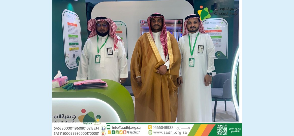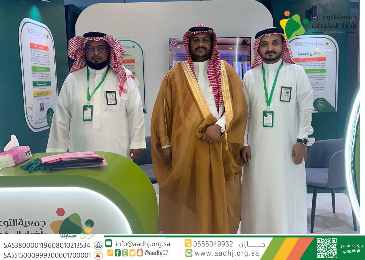 من جهته أكد رئيس الجمعية د. سطام جده أن مشاركة الجمعية تأتي من خلال المعرض لإبراز دورها في رفع مستوى الوعي و التوعية بمخاطر المخدرات، وذلك في إطار تثقيف زوار المعرض من مختلف فئات المجتمع ، والتعريف بطرق وأساليب الوقاية من تعاطي المخدرات وأضرارها على الفرد والأسرة والمجتمع، وكذلك تستعرض لـ لزوار المعرض مشاريع الجمعية التي تشمل تدريب المتطوعين والمتعاونين بالإضافة إلى مشروع لـلتأهيل وعلاج المدمنين والمدمنات من المخدرات ، ومشروع مملكتي لتقديم الندوات التوعوية والمعارض المتنقلة ، إلى جانب ذلك مشروع تمكين لتدريب المتعافين وتأهيلهم لسوق العمل وتأهيل اسر المتعافين ومرسم للأطفال لتعزيز القيم والهوية الوطنية، مشيدًا في هذا الإطار على أهمية وضرورة تفعيل دور الشراكة بين الجهات الحكومية والأهلية في تعزيز حصانة المجتمع تجاه المخدرات، وذلك من خلال التوعية بأضرار المخدرات والمؤثرات العقلية على المجتمع السعودي، وعبر رئيس الجمعية د. سطام جده عن خالص شكره وتقديره لصاحب السمو الملكي الأمير محمد بن ناصر بن عبد العزيز أمير منطقة جازان لما تجده الجمعية من متابعة واهتمام دائم من سموه لمختلف الأعمال ومهام الجمعية ودعمه لبرامجها التوعية ، سائلا الله للجميع العون والسداد..