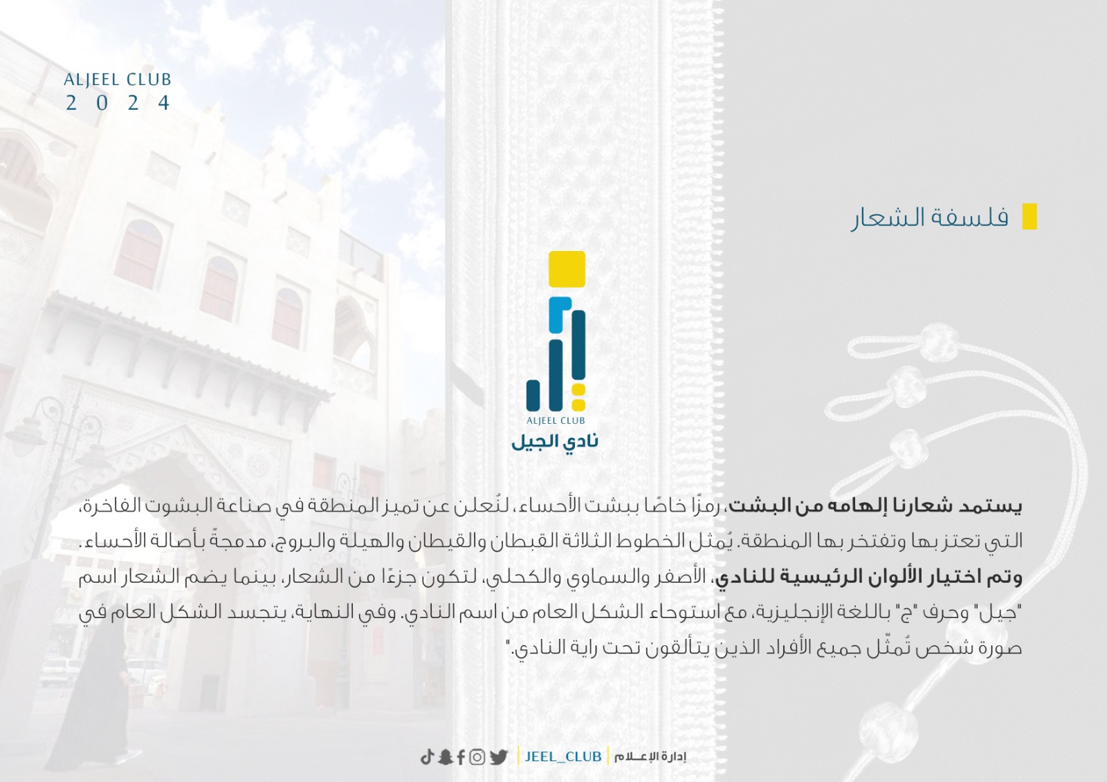 هذا وقدم رئيس مجلس إدارة نادي الجيل الأستاذ عمر بن مبارك بوعركة جزيل شكره لفريق العمل بقيادة نائبة الأستاذ أحمد بن إبراهيم صائم ومدير إدارة الأعلام الأستاذ محمد بن عبدالغني الرويشد والمصمم الأستاذ حمد بن صالح الرويجح على ما قدموه من عمل وظهورهم بهذا الشعار الذي يمثل عراقة الكيان المرتبط بتاريخ الأحساء التليد.