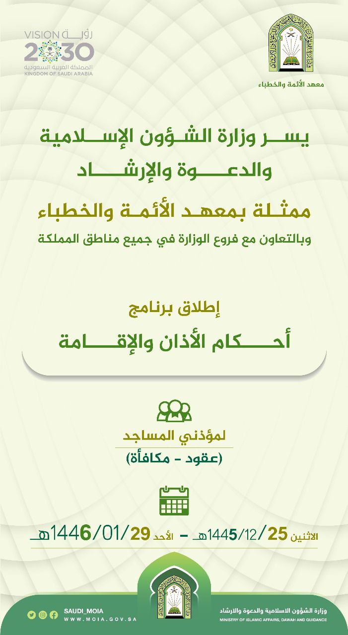 تطلق وزارة الشؤون الإسلامية والدعوة والإرشاد، ممثلة بمعهد الأئمة والخطباء، وبالتعاون مع فروع الوزارة بمختلف مناطق المملكة، البرنامج العلمي (أحكام الأذان والإقامة) والذي يقدمه مجموعة من الأكاديميين والمتخصصين لمؤذني المساجد، يبدأ اليوم الاثنين الخامس والعشرين من شهر ذي الحجة 1445هـ، ويستمر إلى يوم الأحد التاسع والعشرين من شهر محرم 1446هـ.