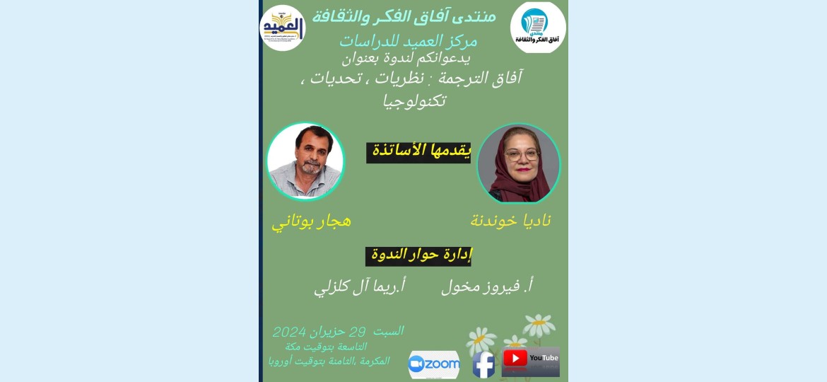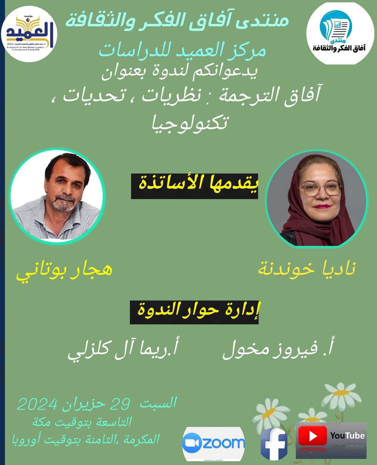 أقام منتدى أفاق الفكر والثقافة بالتعاون مع مركز العميد للدراسات مساء يوم السبت الموافق 29/6/2024 ندوة بعنوان: أفاق الترجمة: نظريات ، تحديات ، تكنولوجيا عبر منصة زوم عن بعد وكان ضيوف الندوة الأستاذة الأديبة القاصة نادية خوندنة أستاذة الأدب الإنجليزي من السعودية ومعها الأديب المترجم السوري الأستاذ هجار يوسف وكانتا المحاورتان المتألقتان بهذا المنتدى الأستاذة فيروز مخول والأستاذة ريما آل كلزلي تديران الحوار وإستهلت الأستاذة فيروز مخول بمقدمة عن عنوان الندوة بالتعريف بأهمية الترجمة في التواصل الإنساني وتاريخها وتقول المحاورة في تعريفها للترجمة: "الترجمة هي جسر تواصلي بين ضفتي لغة و آخرى و كونه علما و صنعة و ممارسة لأبداع، و نحت في جسد منظومة لغوية ثانية لخلق صورة ليست بالضرورة طبق الاصل عند النسخة الأصلية فالترجمة مهنة قديمة في تاريخ الانسانية، فاغلب الملاحم و الأساطير القديمة قد تم ترجمتها من لغاتها الأصلية أو الأساسية إلى لغات مجاورة أو بعيدة عنها جدًا أرضا وجغرافية، فملحمة جلجامش تم ترجمتها من لغات سومرية إلى بابلية و غيرها وقد وصلت البشرية عبر نسخها المترجمة و هكذا أساطير الأغريق و الرومان ولولا علوم و جهود المترجمين لما وصلتإلينا شيئ منها" ثم أخذت دفة الحوار الأستاذة ريما وإستعرضت فيه أهم محاور الندوة أمام الضيفان وذكرت بأن أهم المحاور الرئيسية التي تكون حديث الندوة للضيفين هي كالتالي: