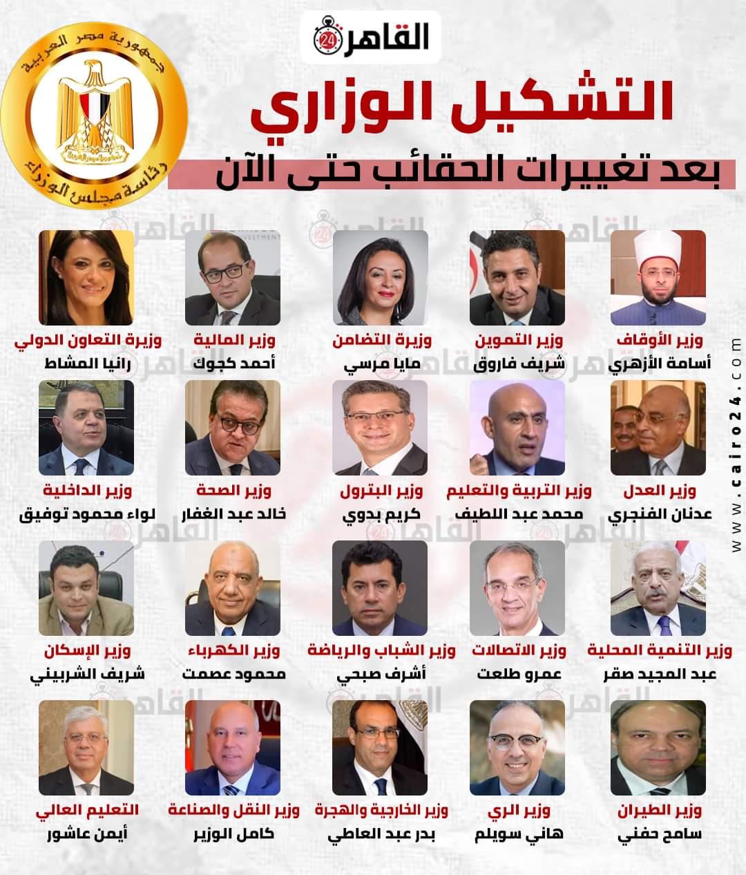 وضم التشكيل الوزاري الجديد، الدكتور خالد عبد الغفار نائب رئيس الوزراء لشؤون التنمية البشرية ووزيرًا للصحة والسكان، والمهندس كامل الوزير نائب رئيس الوزراء لشؤون الصناعة ووزيرًا للنقل، والفريق أول عبد المجيد صقر وزيرًا للدفاع والإنتاج الحربي، واللواء محمود توفيق وزيرًا للداخلية، وبدر عبد العاطي وزيرًا للخارجية والهجرة، والمستشار عدنان فنجري وزيرًا للعدل، وأحمد كوجوك وزيرًا للمالية.
