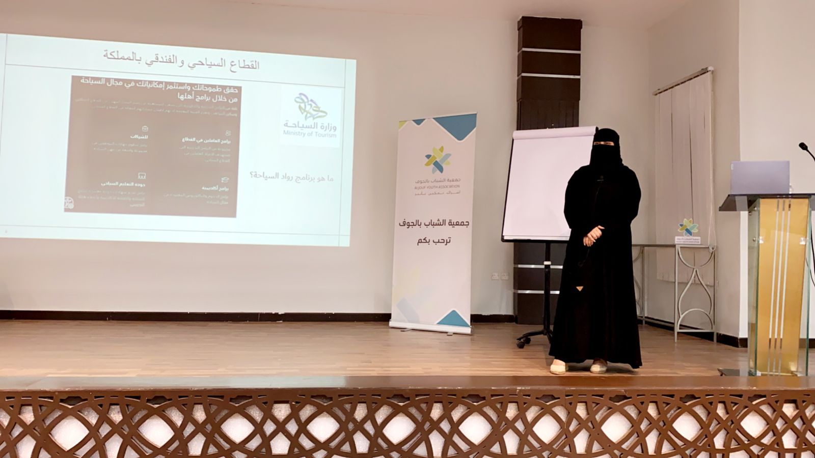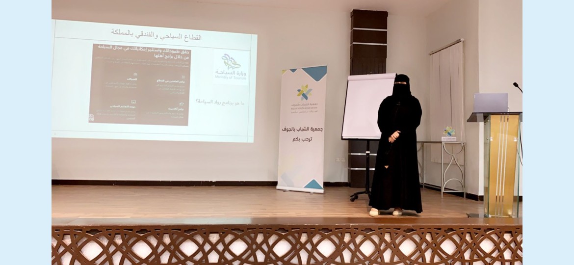 استعرضت عضو مجلس إدارة الجمعية السعودية للسياحية المدربة المعتمدة بالمجال السياحي والفندقي المها بنت حمود الرويلي عددًا من الفرص الاستثمارية والاقتصادية، وذلك في اللقاء الذي نظمتة جمعية الشباب بالجوف والمركز الوطني للقطاع (غير الربحي) بالتعاون مع "شركة قنديل" للتدريب والاستشارات.