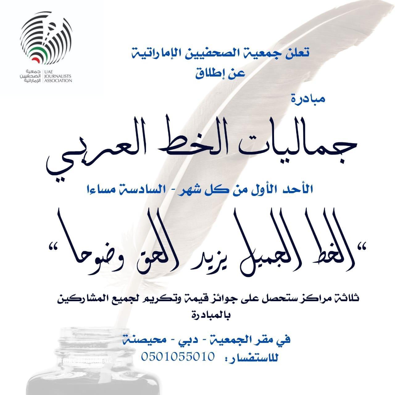 أعلنت جمعية الصحفيين بدولة الإمارات العربية المتحدة عن اطلاق مبادرة جديدة لجماليات الخط العربي. وتنطلق المسابفة اعتبار من مساء يوم بعد غد الاحد بمناسبة السنة الهجرية الجديدة ١٤٤٦ ه، وتستمر في كل يوم احد من كل اسبوع حتى يحين حلول موعد احتفالات الدولة وذلك في المقر الرئيسي للجمعية بدبي. وسيحصل الفائزون الثلاثة الاوائل على جوائز وشهادات تقديرية وتقام تحت شعار الخط الجميل يزيد الحق وضوحا. ويشترط في المتسابقه او المتسابقة كتابة عبارة واحده وان يكون الخط واضحا بقلم جاف او حبر. وتهدف المسابقة إلى تعزيز وتكريس الابداع التعبيري لجماليات الخط العربي وفق رؤى جديدة.