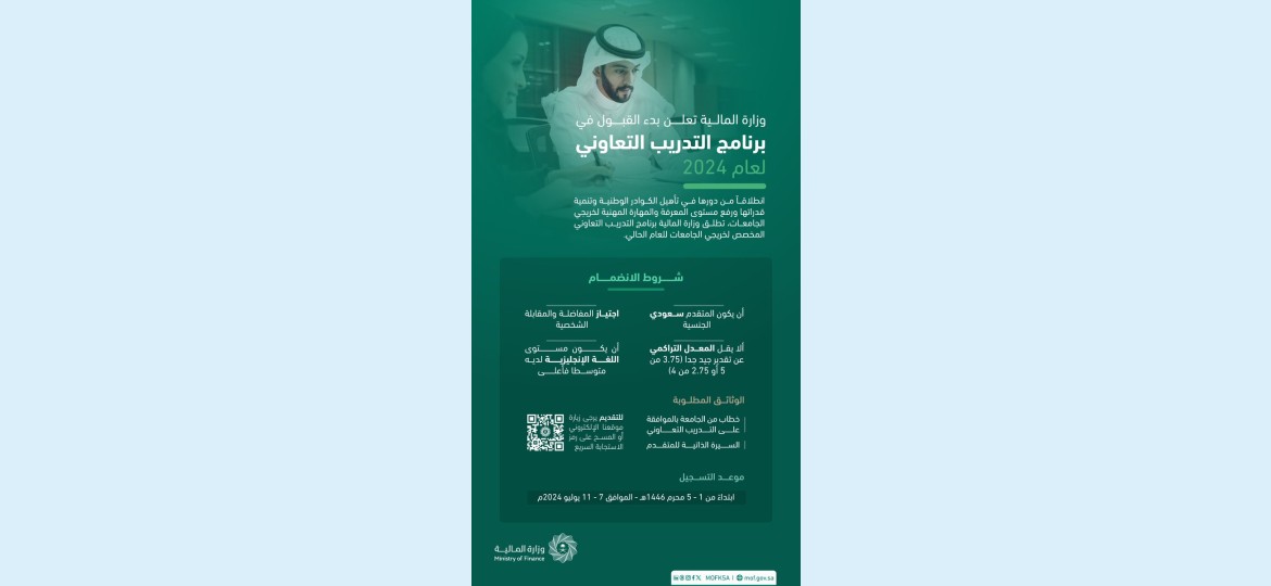 أعلنت وزارة المالية بدء القبول في برنامج التدريب التعاوني المخصص لطلاب وطالبات الجامعات لسنة التخرج 2024م. ويهدف البرنامج إلى رفع مستوى المعرفة والمهارة المهنية لطلاب وطالبات الجامعات لسنة التخرج عبر منحهم فرصاً تدريبية حسب التخصصات المطلوبة لكل فصل، وذلك انطلاقاً من دور الوزارة وتحقيقاً لأهدافها في مجال المسؤولية الاجتماعية عن طريق تأهيل الكوادر الوطنية وتنمية قدراتها، وذلك وفقًا للتفاصيل الموضحة أدناه.