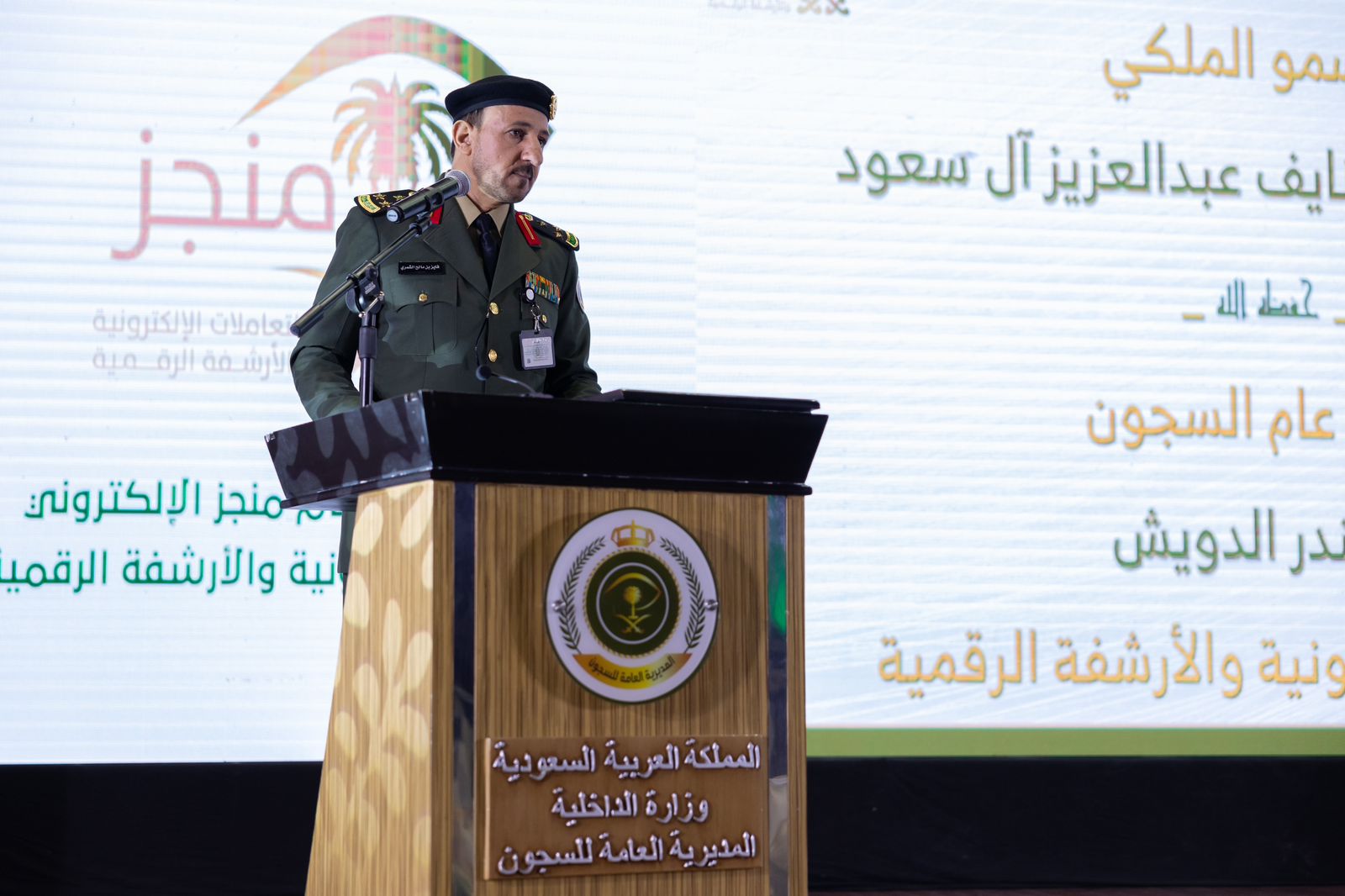 برعاية صاحب السمو الملكي الأمير عبدالعزيز بن سعود بن نايف بن عبدالعزيز وزير الداخلية، دشن مدير عام السجون اللواء ماجد بن بندر الدويش نظام منجز للتعاملات الإلكترونية والأرشفة الرقمية بمقر المديرية العامة للسجون بمدينة الرياض وذلك بحضور الرئيس التنفيذي لبرنامج تطوير وزارة الداخلية المهندس نبيل بن خالد الدبل.