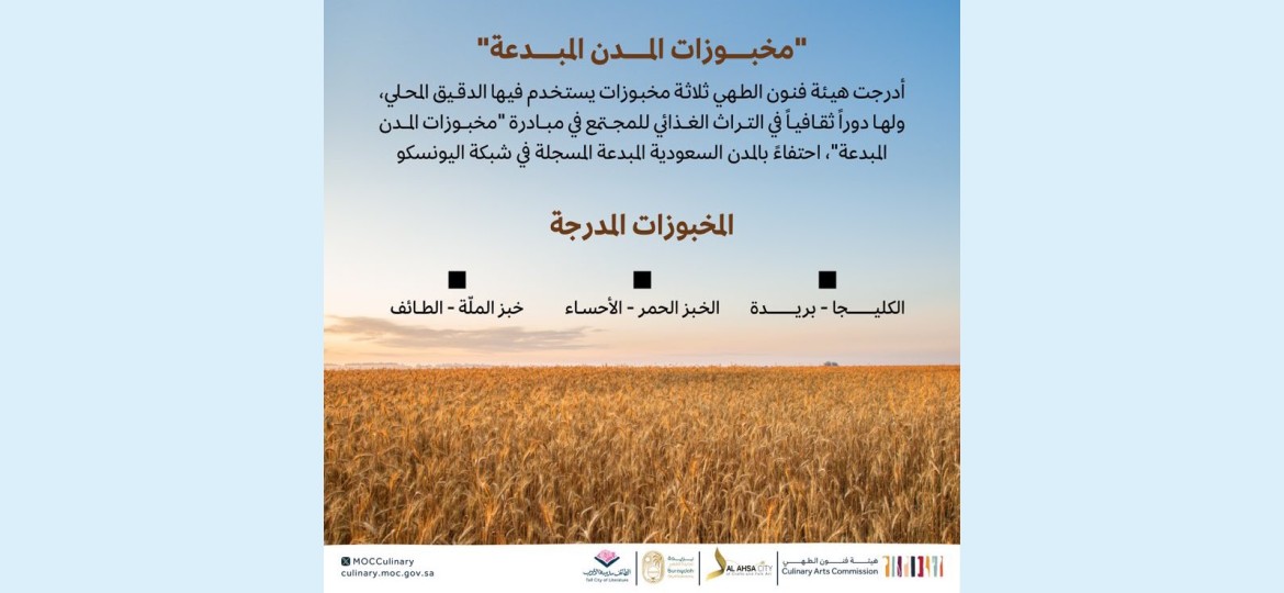 أدرجت هيئة فنون الطهي ثلاث مخبوزات يستخدم فيها الدقيق المحلي، ولها دورًا ثقاقيًا في التراث الغذائي للمجتمع في مبادرة "مخبوزات المدن المبدعة" احتفاءً بالمدن السعودية المبدعة المسجلة في شبكة اليونسكو. وتمثلت المخبوزات السعودية الثلاث في التالي: - خبز الملة من الطائف. - الخبز الأحمر من الأحساء. - الكليجا من بريدة.
