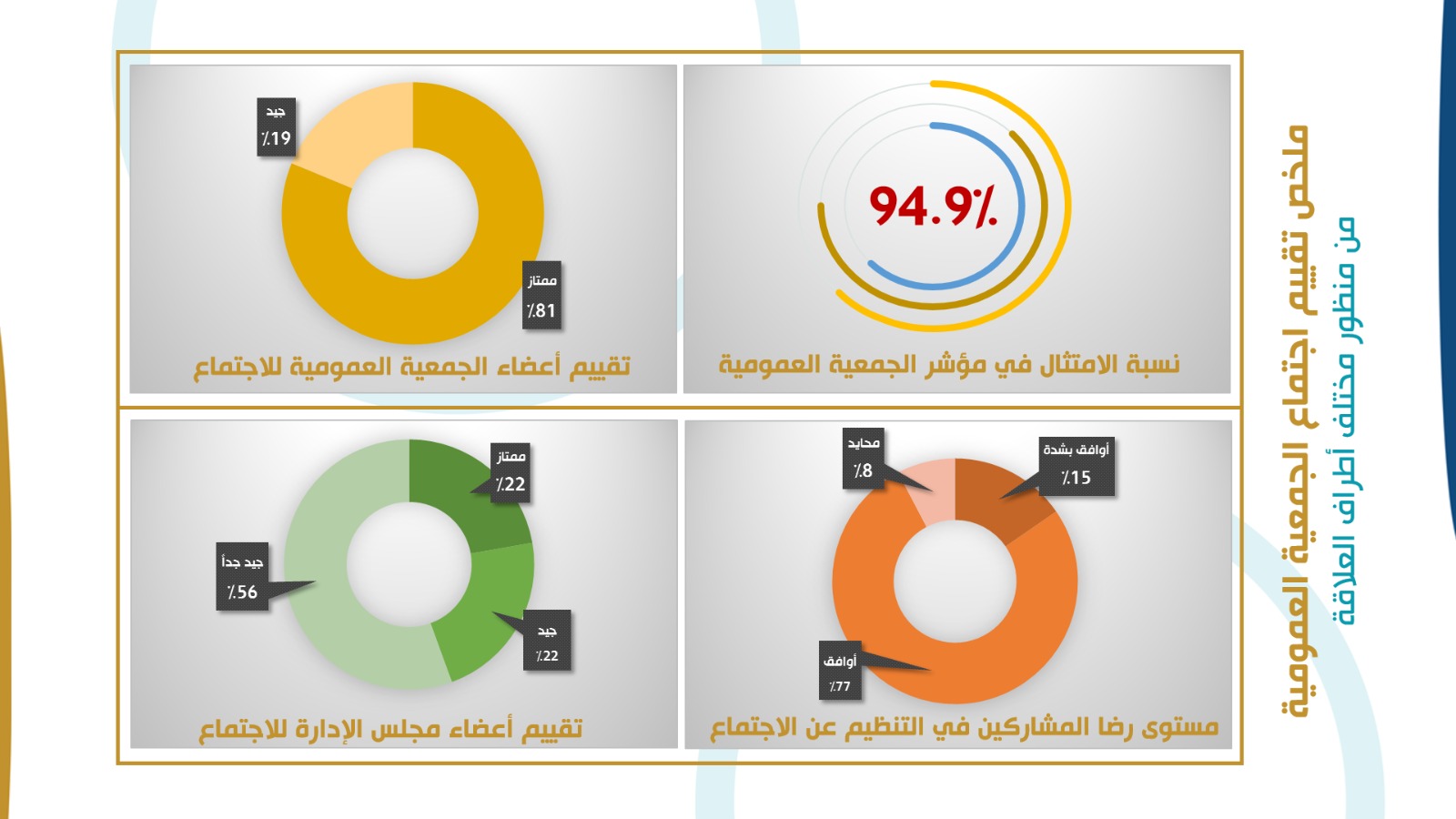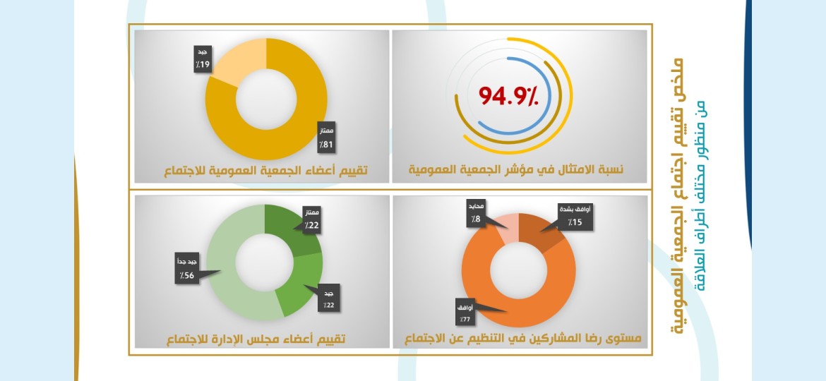 وقال رئيس مجلس الإدارة الأستاذ شوقي المطرود " حرصنا في هذا التقرير على تقييم جوانب اجتماع الجمعية العمومية من منظور مشترك يجمع كافة الأطراف ذوي العلاقة بالجمعية العمومية وباستخدام مجموعة من الأدوات والمعايير المختلفة، آملين أن يسهم هذا الجهد في حوكمة أعمال الجمعية وتحقيق رؤيتها المستقبلية الرامية إلى التميز المؤسسي".