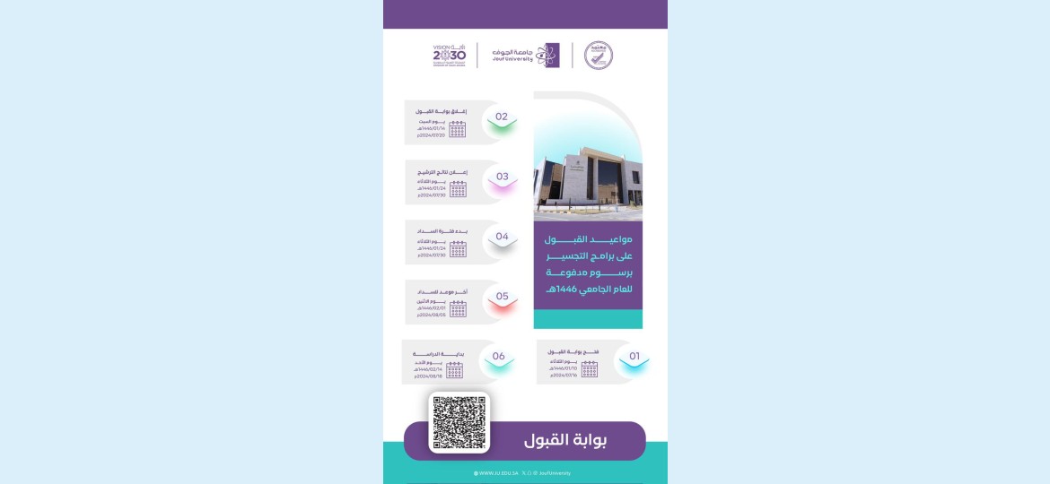 أعلنت جامعة الجوف، مواعيد القبول في برامج التجسير بالرسوم المدفوعة للعام الجامعي ١٤٤٦ هـ، التي تبدأ من الثلاثاء المقبل العاشر من محرم الجاري. وحددت البرنامج الزمني لمواعيد القبول بفتح بوابة القبول، يوم الثلاثاء 10 محرم، وحتى السبت 14 محرم 1446 هـ وإعلان نتائج الترشح بتاريخ 24 محرم من العام الجاري، فيما ستتيح الجامعة فترة السداد من 24 محرم ولغاية الأول من صفر لعام 1446 هـ، وبداية العام الدراسي يوم الأحد 14 صفر 1446 هـ. وتتيح الجامعة تخصصات مختلفة لبرنامج التجسير في التمريض، وعلوم المختبرات الإكلينيكية، وعلوم الحاسب، ونظم المعلومات، والهندسة المدنية والهندسة الكهربائية، وإدارة الأعمال والمحاسبة والتمويل والاستثمار، عبر 5 كليات.
