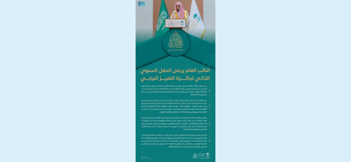 يُذكر أن مجلس النيابة العامة أطلق جائزة "التميز النيابي" كجائزة سنوية تهدف إلى تكريم المتميزين من أعضاء النيابة العامة ومنسوبيها في مختلف مناطق المملكة، حيث تعتمد الجائزة على إستراتيجية تقييم دقيقة، تأخذ في الاعتبار مؤشرات الإنجاز ومدى الالتزام الوظيفي، مع التركيز على المهنية العالية، مما يسهم في تعزيز روح التنافس الإيجابي والارتقاء بمستوى الأداء داخل النيابة العامة.