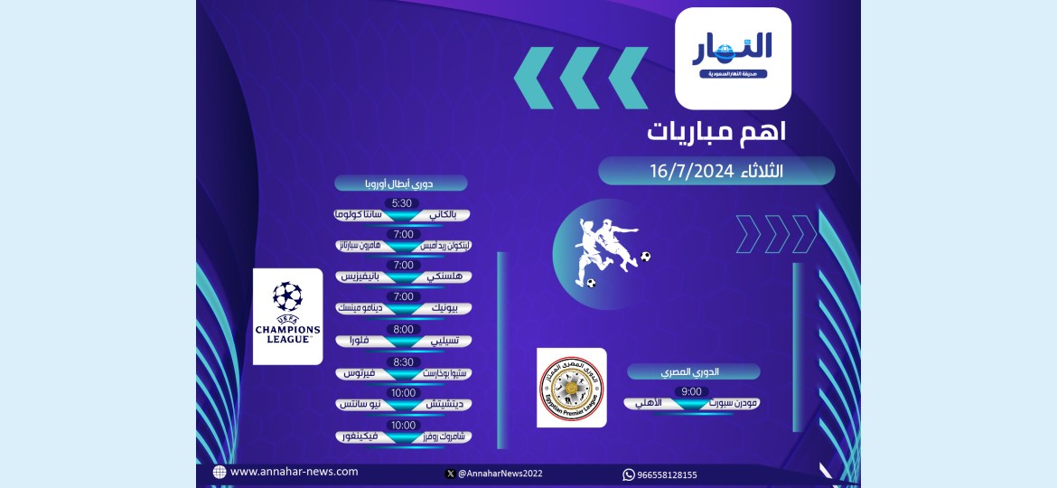 يحرص عشاق ومحبو كرة القدم على معرفة جدول مواعيد مباريات يوم غدًا الثلاثاء 16 / 7 / 2024م، في البطولات الأوروبية والعربية، حيث منافسات بطولة دوري أبطال أوروبا من الأدوار التمهيدية، بالإضافة إلى بطولة الدوري المصري.