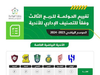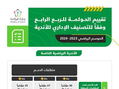 أعلنت وزارة الرياضة عن نتائج تقييم مبادرة الحوكمة للأندية الخاصة والعامة عن الربعين الثالث والرابع من الموسم الرياضي 2023/2024.