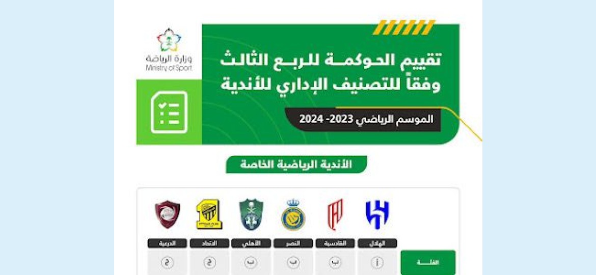 وتم تقسيم الأندية، كما أعلنت وزارة الرياضة اليوم السبت الموافق 2024 - 7 - 20 بنتائج تقييم مبادرة الحوكمة إلى 5 فئات هي: أ، ب، ج، د، هـ..